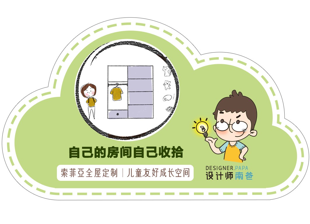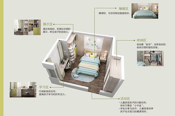 儿童房不是一个纯粹的物理空间概念,可分为展示区、学习区、睡眠区、收纳区和活动区,通过分房建立孩子关于人际交往的界限意识,是培养孩子健康社交观的第一步。