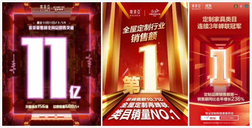 电商渠道方面,在今年的全民购物狂欢节中,索菲亚在京东、天猫等平台共同发力,最终全网总销售业绩突破11亿元。其中,索菲亚天猫官方旗舰店以10.7亿 的销售额刷新纪录,再度蝉联全屋定制销售冠军,并实现了定制衣柜类目7连冠。索菲亚京东双十一同样大放异彩,成功将“定制家具销售冠军”纳入囊中,至此,索菲亚已经是连续三年蝉联京东双十一品类冠军。