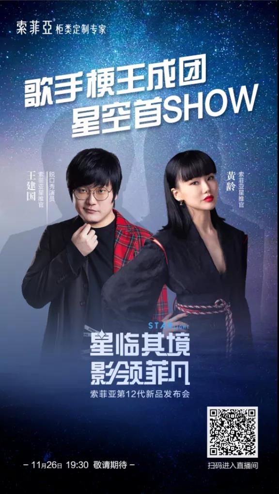 如果黄龄换个地方唱歌,在星空下唱怎么样?如果王建国在星空下寻找灵感,献上第一次星空脱口秀,那会带来怎样的惊喜和欢乐?11月26日,索菲亚“星临其镜,影领菲凡”——第12代新品发布会即将盛大举办,脱口秀演员王建国和浴室歌后黄龄将惊喜现身,一起探秘"星”世界,见证新品上“星”!