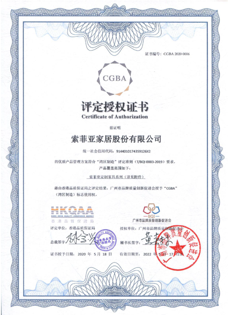 今年7月10日,广州市品牌质量创新促进会与香港品质保证局共同为索菲亚进行”湾区制造“评定授证。参与"湾区制造"评级企业需是行业龙头标杆企业、细分领域独角兽企业、某技术产品制造领域具有行业引领性及业绩优秀企业。