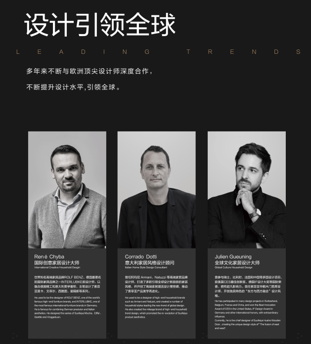 为给品牌注入更多活力,索菲亚始终在投入大量心血,通过携手多位世界知名设计师共同打造家居产品,给消费者营造品质、时尚的家居生活。这些设计师都是国际上的佼佼者,包括意大利创意家居设计大师René Chyba、意大利家居风格设计顾问Corrado Dotti、全球文化家居设计大师Julien Gueuning,他们对设计追求完美和极致。