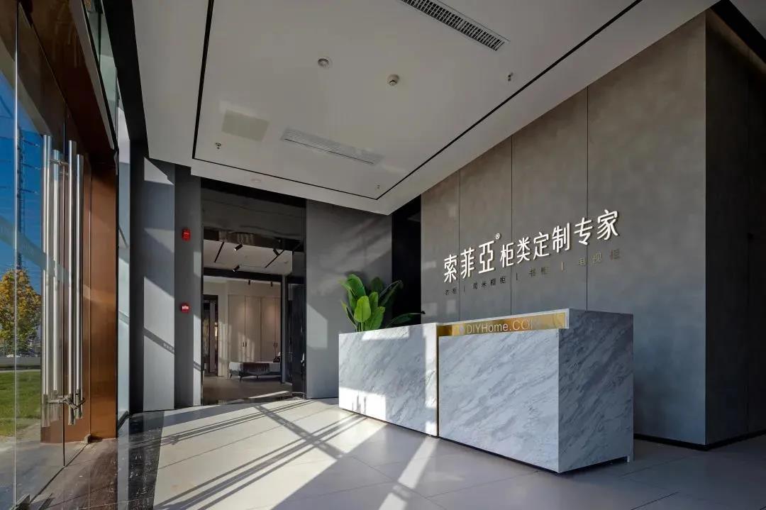 门头是品牌的主要外部标志,来到这个3000平的店,首先映入眼帘的是索菲亚柜类定制专家灰色调的高级感门头,以品牌视觉logo和slogan结合索菲亚SI终端系统,强化了品牌定位和视觉记忆力。