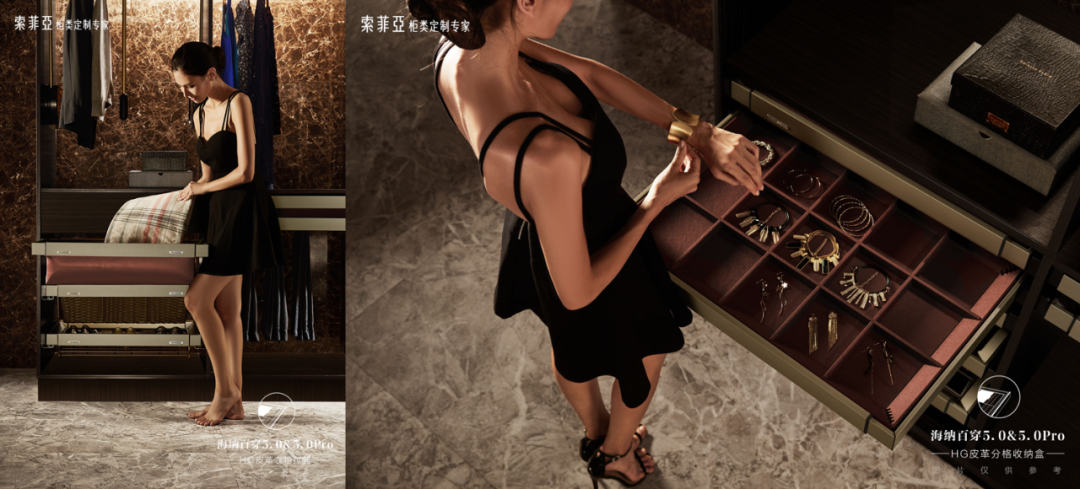 为了满足这一需求,海纳百穿系列本次推出了海量精细化收纳配件,小到一只耳环,大到一套西装,都有其各自专属的配件,以达到分门别类、各得其所的效果,让收纳更有序,家居更精致。