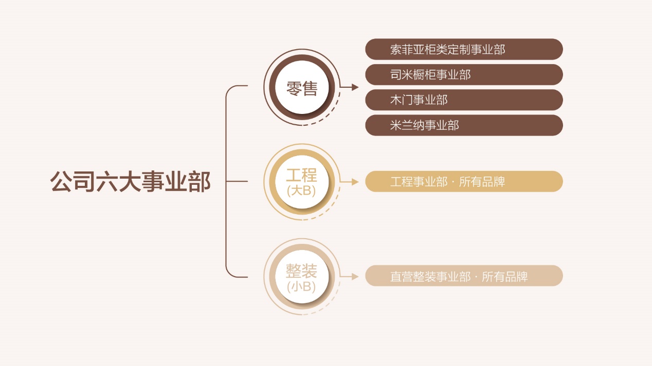 2020年,公司完成多品牌矩阵的规划和初步的布局,四大品牌,全品类、全渠道运营。为实施公司发展规划,实现组织高效运行,公司进行了组织变革,实行事业部管理机制,成立了索菲亚柜类定制事业部、司米橱柜事业部、木门事业部、工程事业部、直营整装事业部、米兰纳事业部六大事业部。2021年,六大事业部将继续深化“全渠道+多品牌+全品类”的集团战略,达成索菲亚集团百亿销售目标。