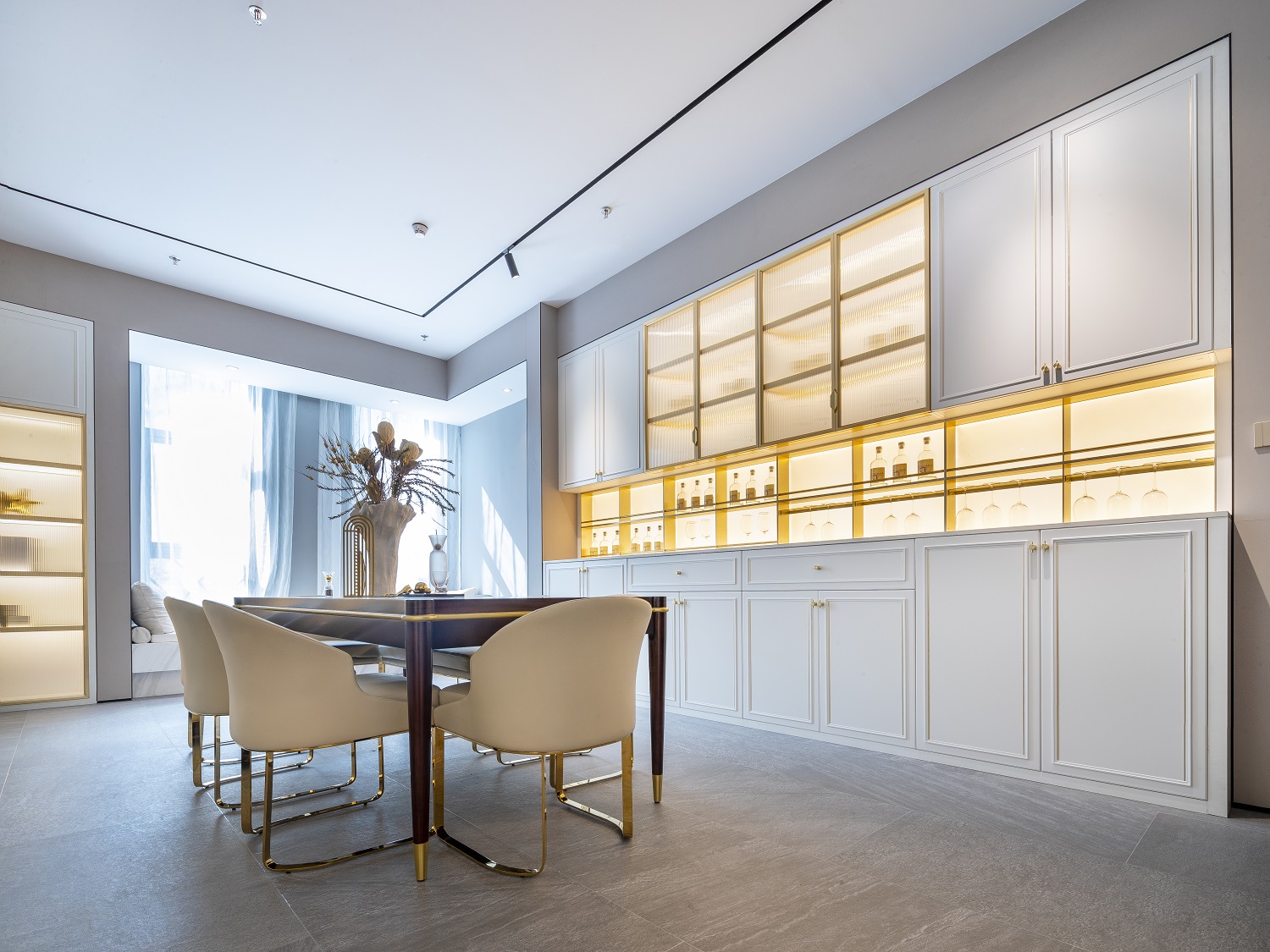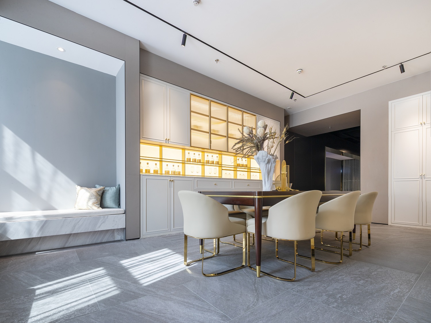 食欲来源于美味的食物与舒适的用餐氛围,餐厅与整体空间风格相融合,意式收纳薄柜为厨房的储物增加便捷,同时又兼具展示功能,整体造型简洁大气,舒适而又极具美感。