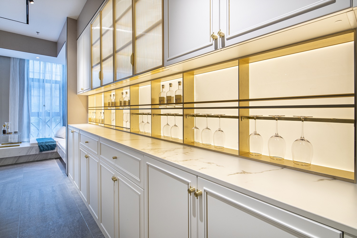 克拉维卡系列符合年轻新贵对时尚的追求以及对家的美好憧憬,以高级哑光的臻白为主色调,搭配轻奢质感冲浪玻璃,与适当的拉丝琉璃金点缀,简洁纯白的空间流露些许奢感,简单纯粹却不单调,置身其中感受每一个空间的温馨与浪漫。
