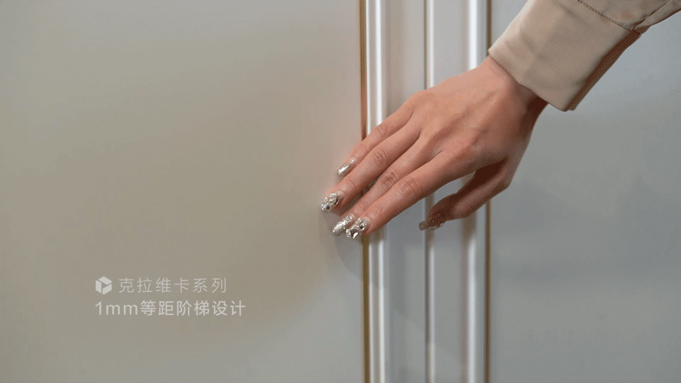 索菲亚设计团队大胆且创新地将黑白琴键平行简约、凹凸有致的造型运用于门板设计,区隔于市面四周封闭的金属点缀设计,通过金属平行点缀,匠造1mm等距阶梯设计,严谨、精准的工艺打造了门板丰富极致的层次感。
