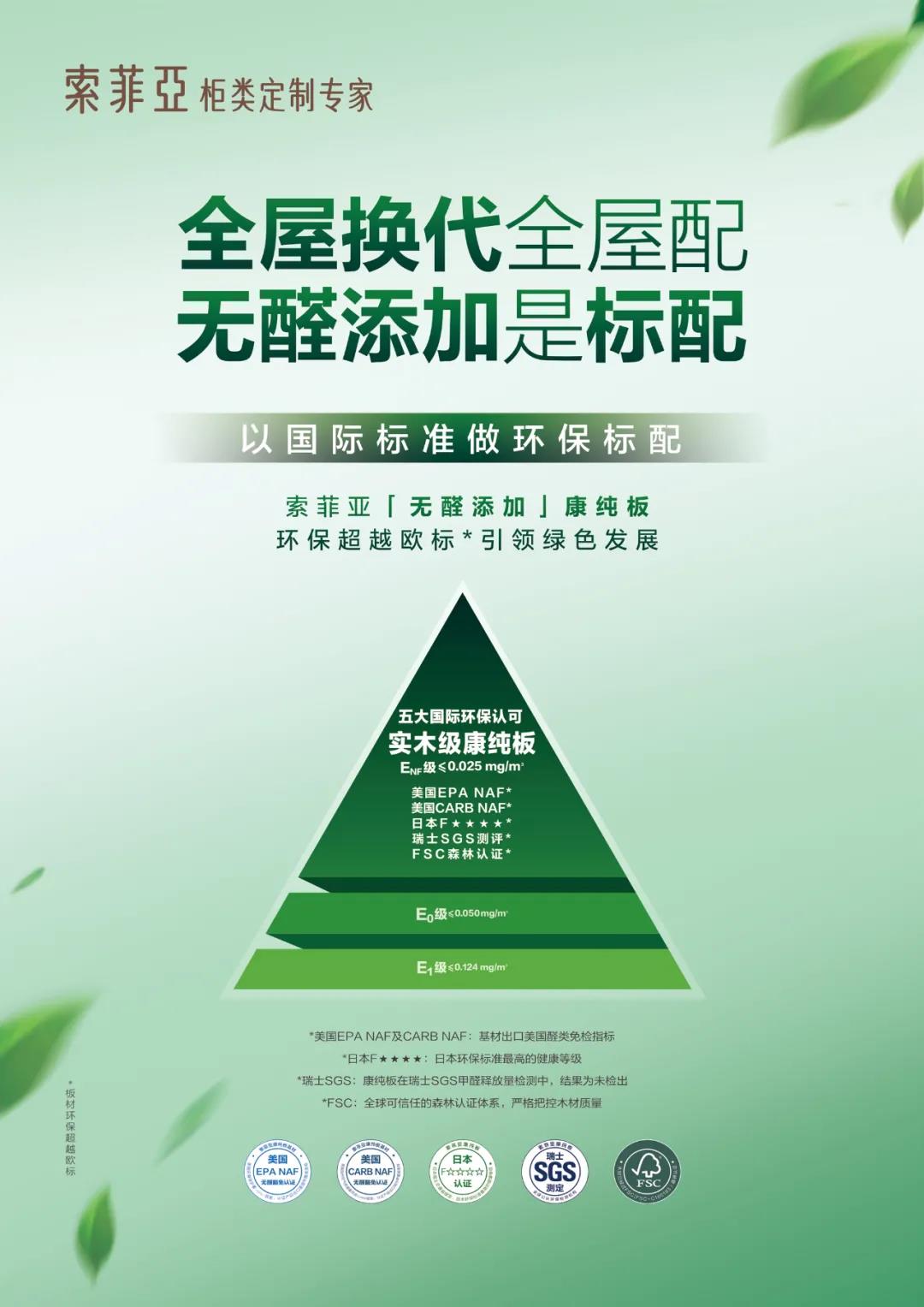 索菲亚凝心聚力做大做强,也始终深刻洞察市场动向和消费需求,不忘初心高质量发展。而环保作为家居质量的生命线,是消费者尤为关注的重点因素,也是家居品牌必须做好的最基本的一点。作为引领家居环保的推动者和引领者,索菲亚早在2014年已推出优于国家标准E1级的企业标准E0板材,2016年,索菲亚升级环保标准,推出基材无醛添加的康纯板,环保性能媲美实木,在业内掀起一股无醛添加热潮,推动整个行业往低醛、无醛方向迈进。截至2020年12月底,索菲亚康纯板的客户占比已上升到74%。