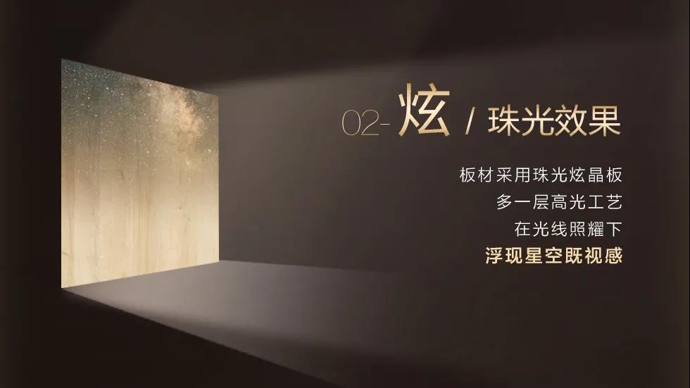 与星影系列一样,本次星潮系列继续沿用了索菲亚创新板材——珠光炫晶板。