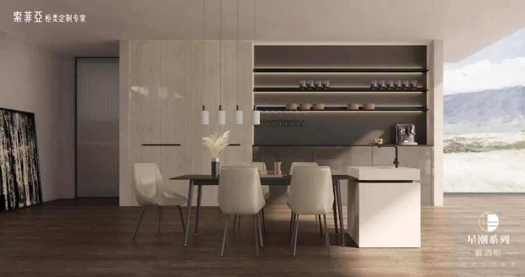 素雅的木纹与奢贵皮纹和谐碰撞,在味蕾的梦幻岛里,悠然享受每一顿。超强的储物与展示功能,将餐厅的温暖在此安放。