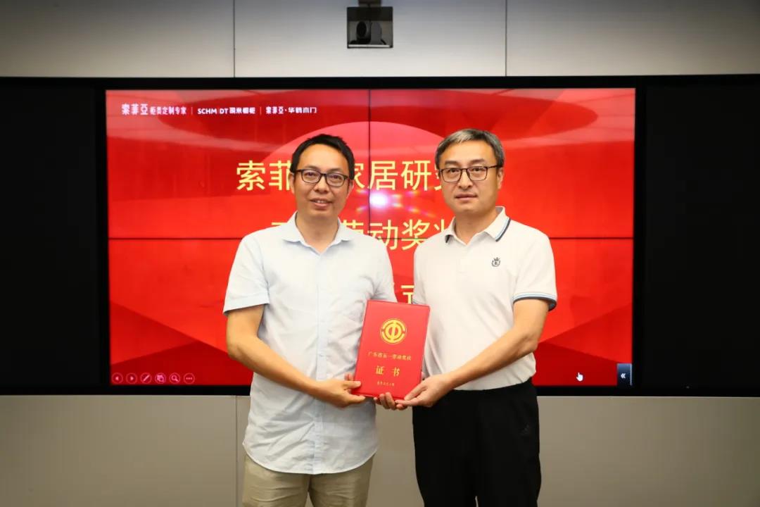 参观新品展厅后,广州市总工会纪晓辉部长在索菲亚大厦主持广东省“五一”劳动奖状授牌仪式,为索菲亚家居研究院授予荣誉牌匾及证书。