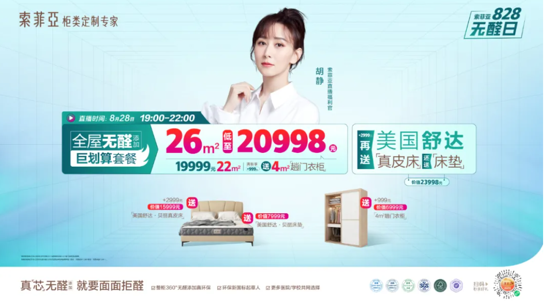 8月28日,索菲亚“828无醛日”明星福利直播如约而至,胡静化身直播福利官,空降索菲亚大厦产品展厅,近距离体验索菲亚和SCHIMIDT司米的多个系列产品,为大家推介时尚家居好物。