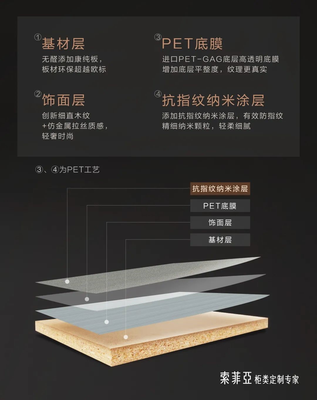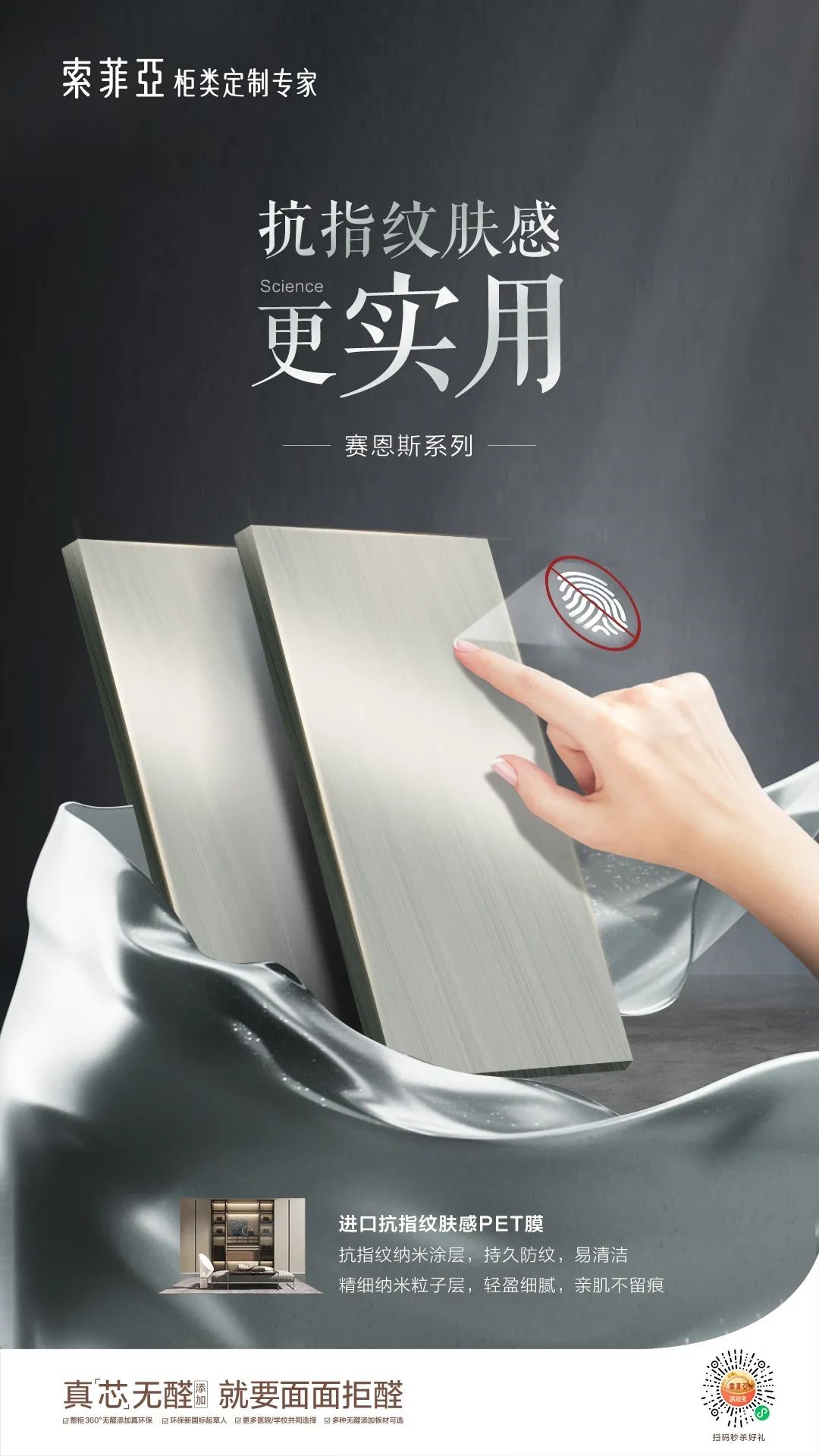 索菲亚设计团队洞悉哑光感柜体在日常使用过程中更容易残留指纹印记,不仅影响柜体美观且不易打理的使用痛点,在门板表面PET膜上增加抗指纹纳米涂层,可持久有效防止指纹遗留,更易清理。