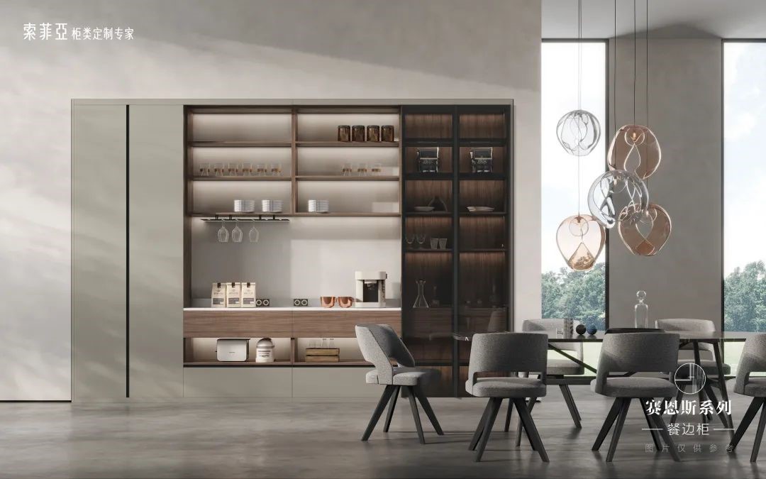 餐边柜整体时尚感、奢感十足,设计合理的开放区,可存放咖啡机等时尚小家电;点缀透明储物区,可用于物品储存与展示,提高空间整体格调。