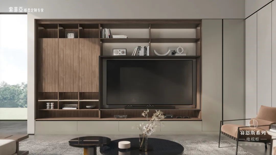 电视柜采用大面积高端木色搭配细直木纹拉丝纹理,整体视觉大气、时尚,增设大面积开放区域,便于储物和展示。