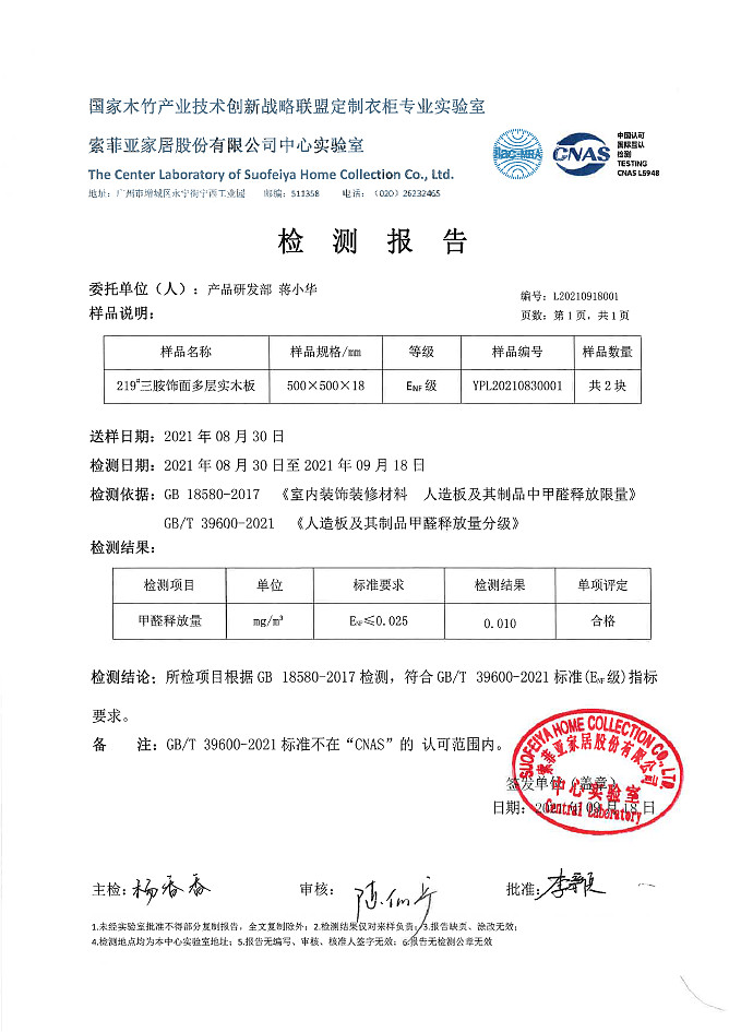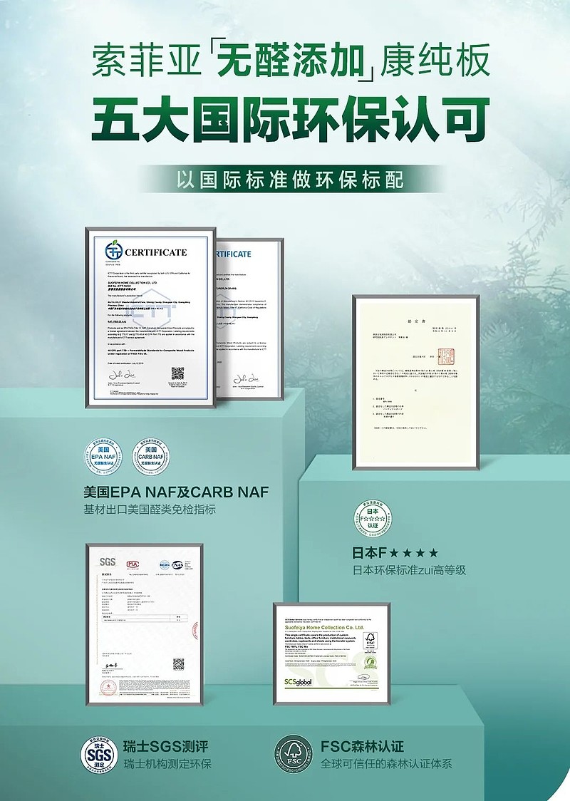 率先在行业获得美国环境保护署EPA颁发的NAF无醛豁免认证,并通过瑞士SGS多项测定;