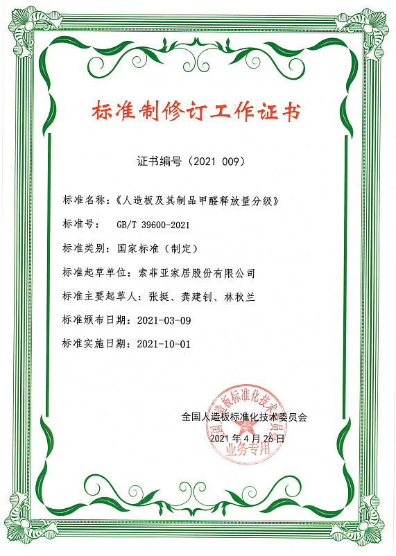 2021年10月1日起,由索菲亚参与标准制定的两项环保新国标——GB/T 39600-2021《人造板及其制品甲醛释放量分级》和GB/T39598-2021《基于极限甲醛释放量的人造板室内承载限量指南》将正式实施。