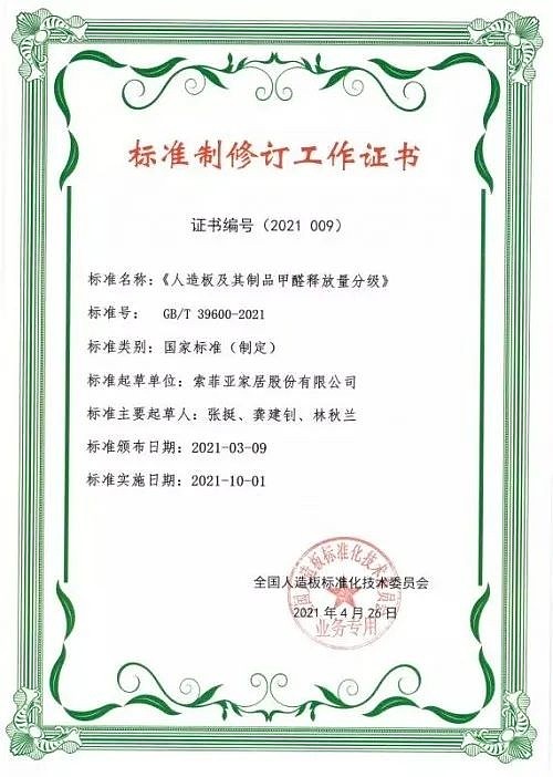 新国标更好地适应新时代的消费需求,通过丰富、全面的分级划分方式,对消费者的选购提供更为完善的指导,对推动我国人造板产业环保水平的提升、促进产业的高质量发展有多重意义。作为企业代表,索菲亚参与了两项标准的起草、推行和申报等工作。