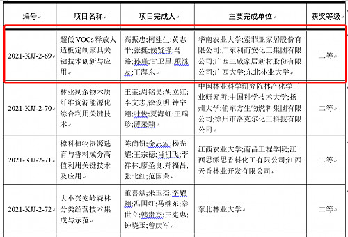 作为两项新国标的起草人之一,索菲亚再次凭借环保科研实力迎来好消息。近期,第十二届梁希林业科学技术奖公布了自然科学奖、技术发明奖和科学进步奖的获奖名单,索菲亚家居有限公司凭借“超低VOCs释放人造板定制家具关键技术创新与应用”项目(以下简称“技术项目”),获得科技进步奖二等奖。