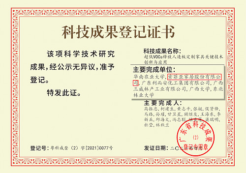 此次获奖技术项目由索菲亚家居研究院联合华南农业大学等机构共同开展研发,从源头上降低VOCs室内污染,保障广大消费者的安全健康。针对超低 VOCs 释放人造板定制家具生产的多种技术难题,技术项目解决超低 VOCs 含量胶粘剂制造技术难题,攻克超低 VOCs 释放人造板制造技术瓶颈,开发有害 VOCs 检测技术。