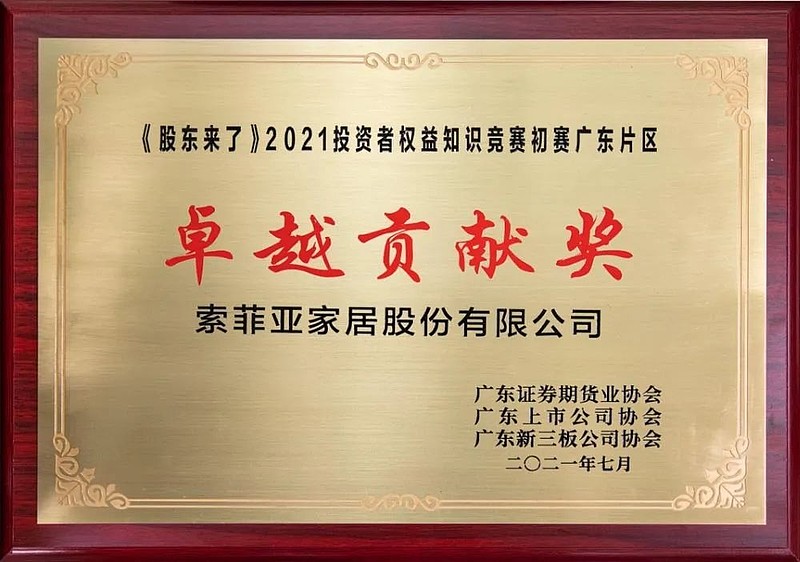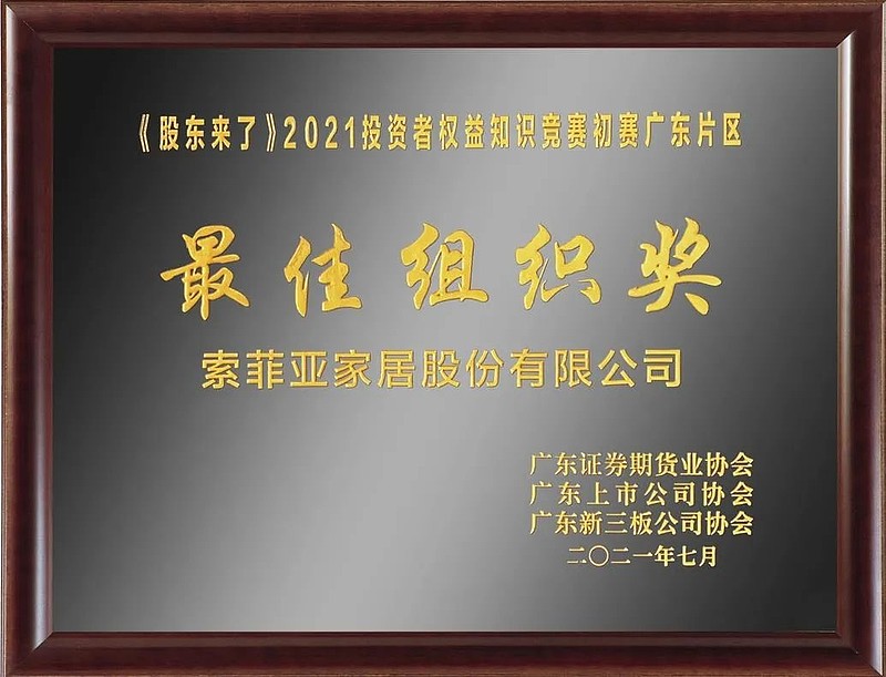 《股东来了》2021投资者权益知识竞赛初赛中,广东证券期货业协会、广东上市公司协会和广东新三板公司协会,对活动中积极支持投资者教育工作、成绩显著的会员单位及相关公司予以表彰。凭借在本次组织活动中的亮眼成绩,索菲亚荣获“卓越贡献奖”和“最佳组织奖”。
