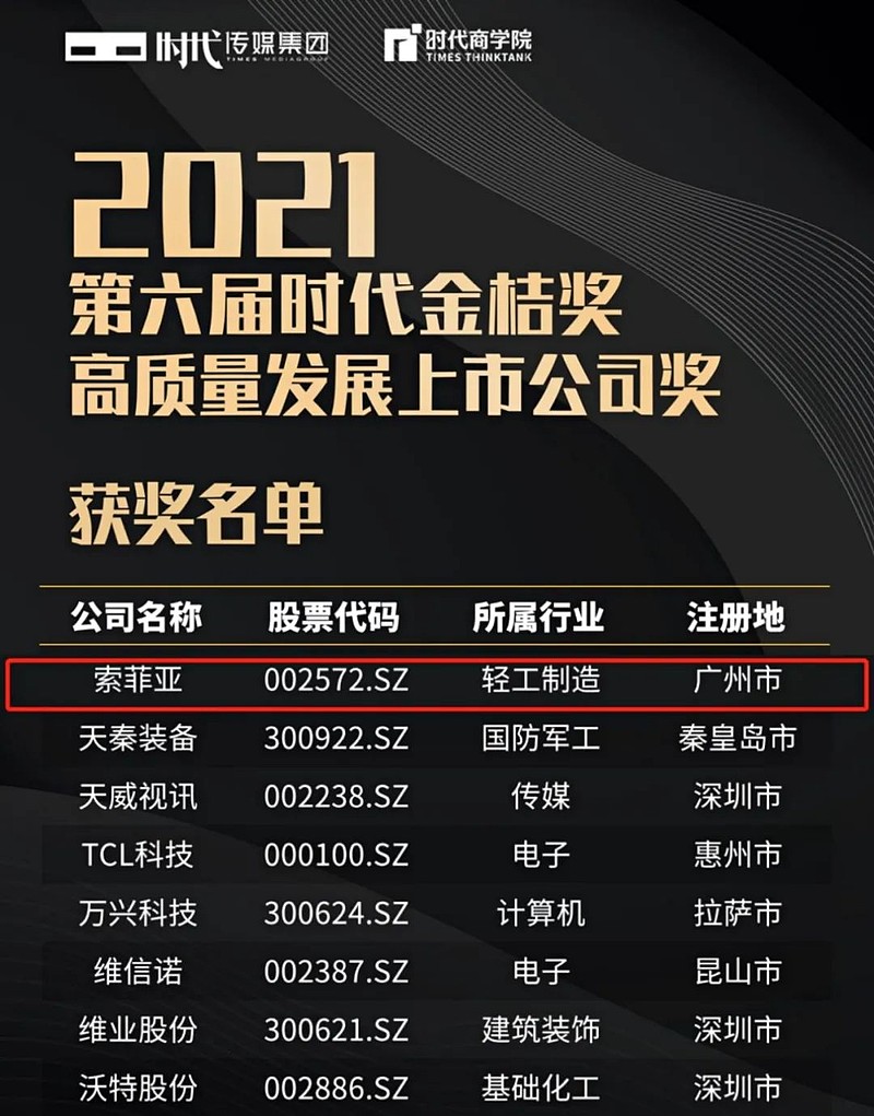 由广东时代传媒集团发起的“2021金桔奖――高质量发展上市公司奖”评选榜单中,索菲亚凭借强大的综合实力与良好的管理运营,荣获“高质量发展上市公司奖”。