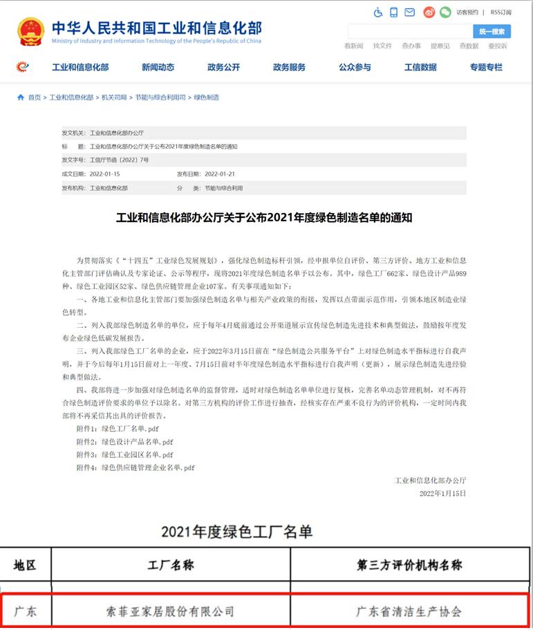 近日,国家工业和信息化部发布了2021年度绿色制造名单,索菲亚作为定制家居代表企业被授予“绿色工厂”称号,这是继获得服务型制造示范企业、高新技术企业后,索菲亚再一次获得国家部门的权威认可,标志着索菲亚成为引领行业绿色发展的示范性标杆企业。