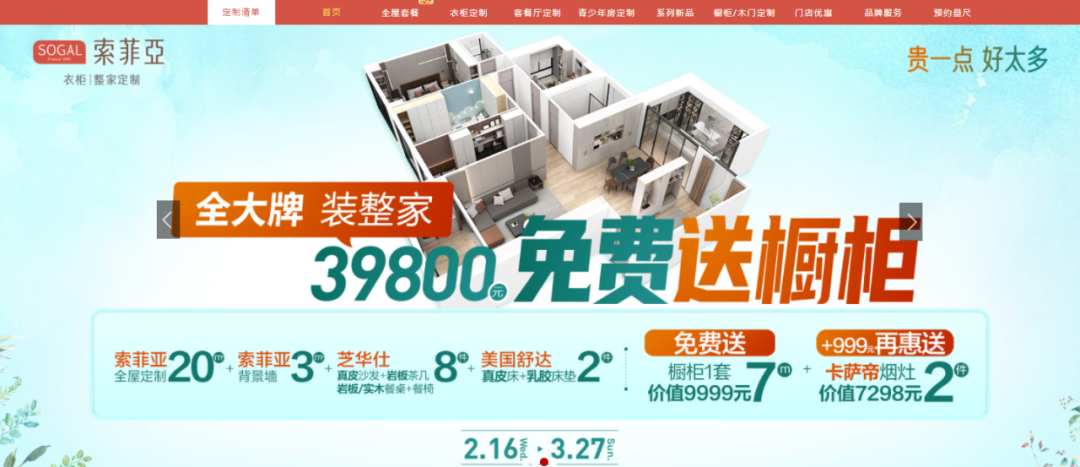 今年初,索菲亚全面推出39800大牌整家套餐,凭借“全大牌、装整家、免费送橱柜”的核心卖点击中广大消费者的真实需求,同时多个强势品牌、全品类产品的整合,以及惊喜的价格优惠,更是让消费者反响热烈。基于消费者的需求和反应,索菲亚在电商渠道进一步深化优势,通过天猫、京东、拼多多等多电商渠道强势推广,广告渠道全覆盖头条、抖音、微信朋友圈、百度、小红书,全方位覆盖主流电商流量入口,让优质套餐有效触达有真实需求的消费人群。