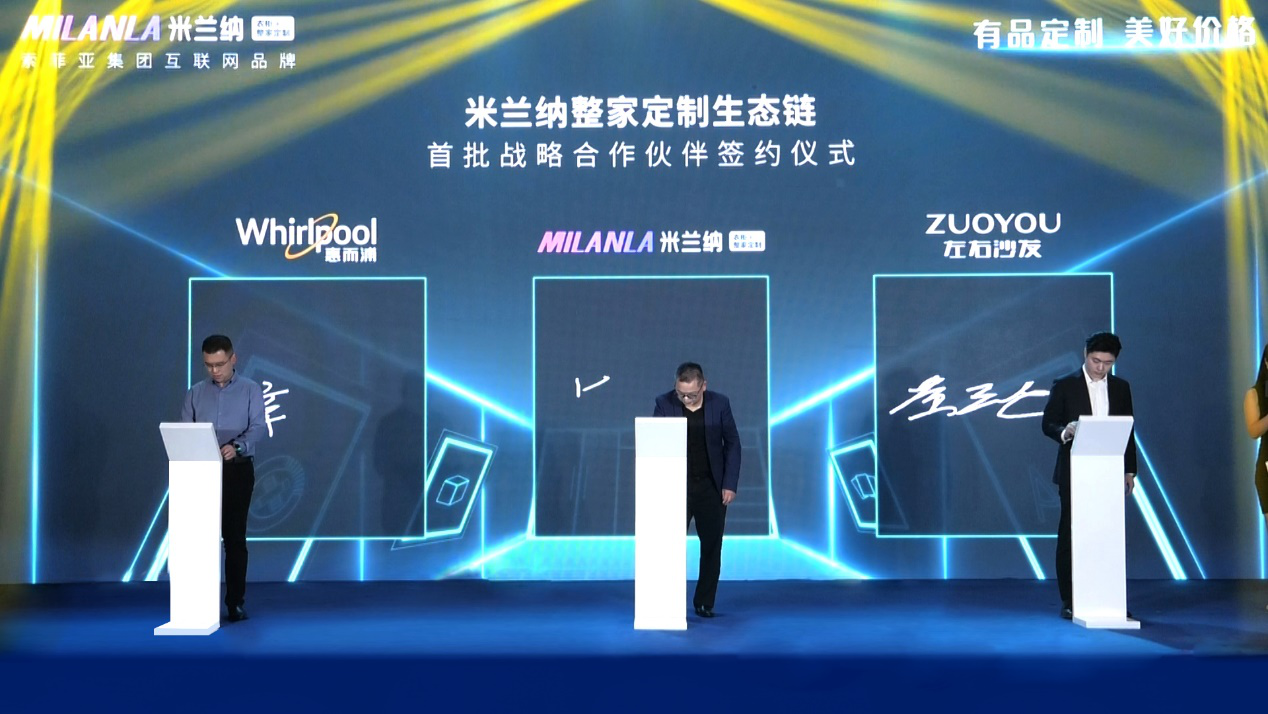 成就来自和衷共济,发展源于戮力同心。在发布会现场,左右设计家总经理黄元正、惠而浦中国区副总裁辛家宁和索菲亚家居米兰纳事业部总经理曾祥伟一起,共同进行了整家定制生态链签约仪式。