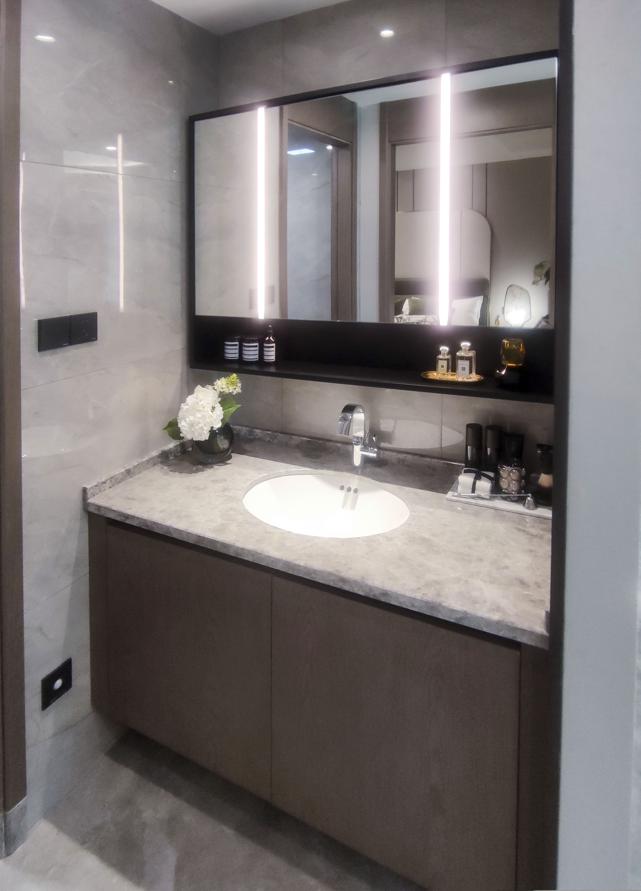 亮点:结合项目主推的风格,采用白色木皮油漆材质铺就温馨而又舒适的居家氛围。简约的悬挂式地柜、全封闭式的镜柜设计,让卫浴空间看起来整洁利落,简约而不简单,满足都市新贵的理性审美。
