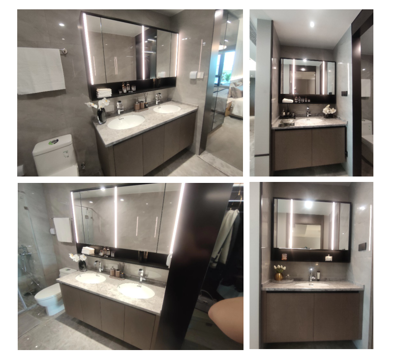 亮点:结合项目主推的风格,采用科技木皮材质铺就温馨而又舒适的居家氛围。简约的悬挂式地柜、全封闭式的镜柜设计,让卫浴空间看起来整洁利落,简约而不简单,满足都市新贵的理性审美。