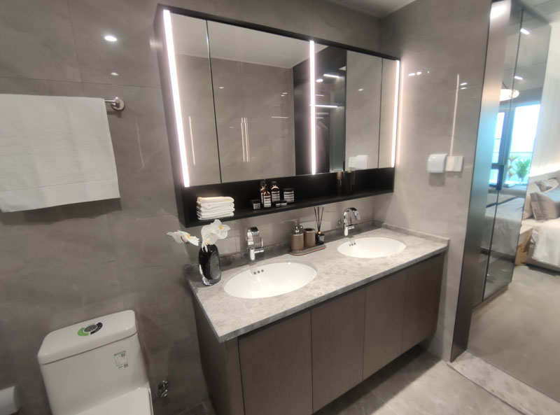亮点:结合项目主推的风格,采用木色PVC材质铺就温馨而又舒适的居家氛围。简约的悬挂式地柜、全封闭式的镜柜设计,让卫浴空间看起来整洁利落,简约而不简单,满足都市新贵的理性审美。