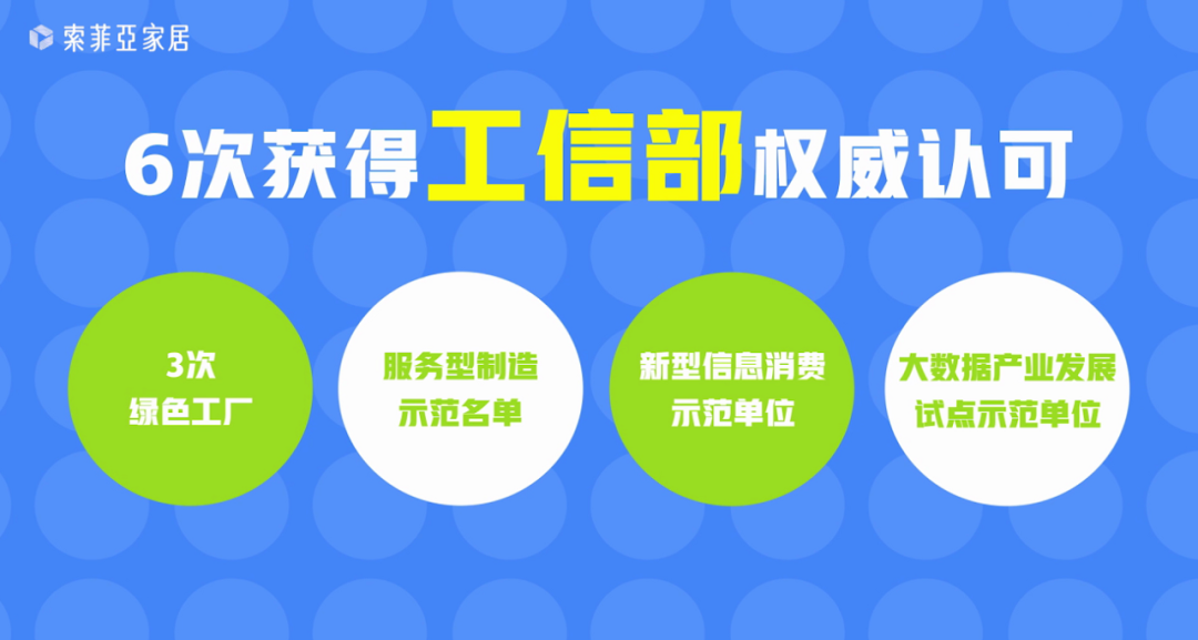 索菲亚家居(浙江)股份有限公司获国家级“绿色工厂”此外,索菲亚家居在信息化、数字化、智能化领域和服务制造领域也曾多次获得国家工信部认可,此前曾获得“服务型制造示范企业”、“新型信息消费示范单位“和”大数据产业发展试点示范单位“。截至目前,索菲亚家居共6次获得工信部权威认可。