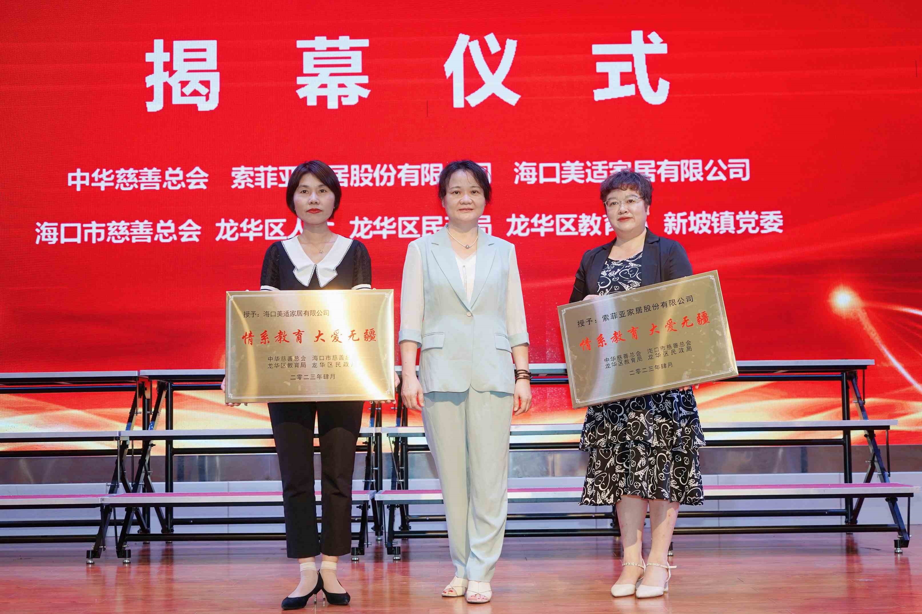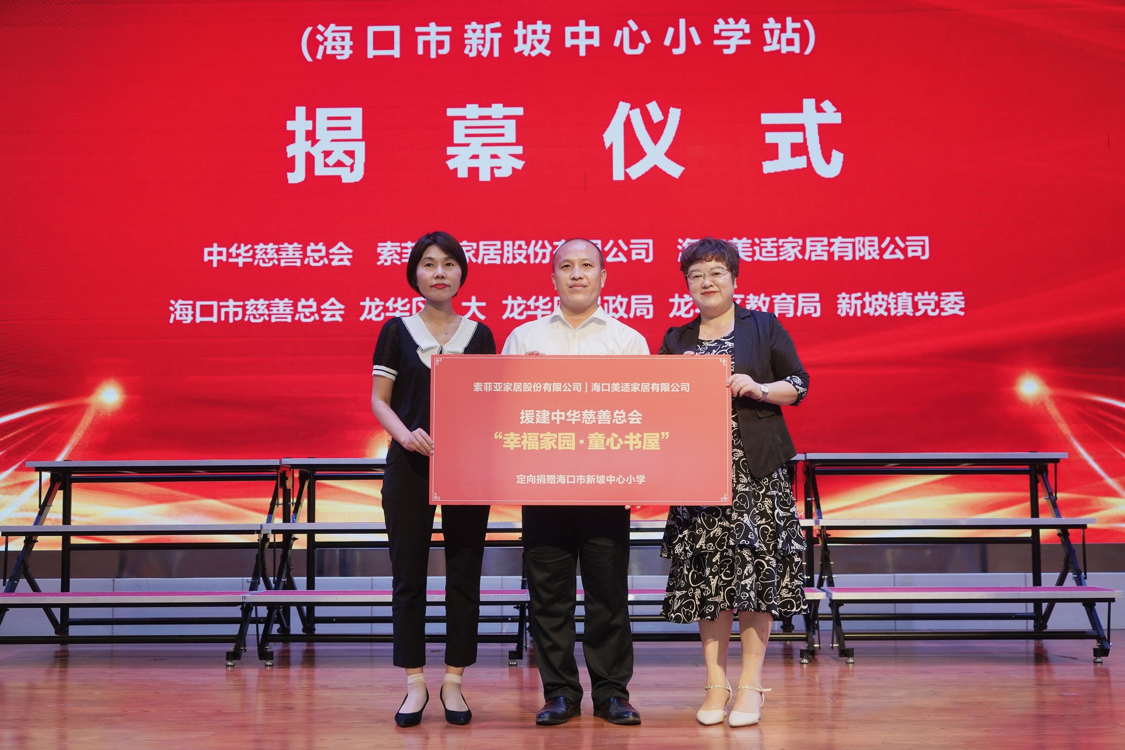 揭幕仪式上,龙华区教育局向索菲亚家居股份有限公司和海口美适家居有限公司2家捐赠企业赠送爱心牌匾,海口市慈善总会副会长王丽霞宣布新坡中心小学“童心书屋”正式落成启用。随后,海口市慈善总会会长叶霞、龙华区人大常委会主任董孟清、索菲亚家居“童心书屋”项目负责人刘建明、新坡中心小学梁安昕校长共同为学校“童心书屋”揭幕挂牌。