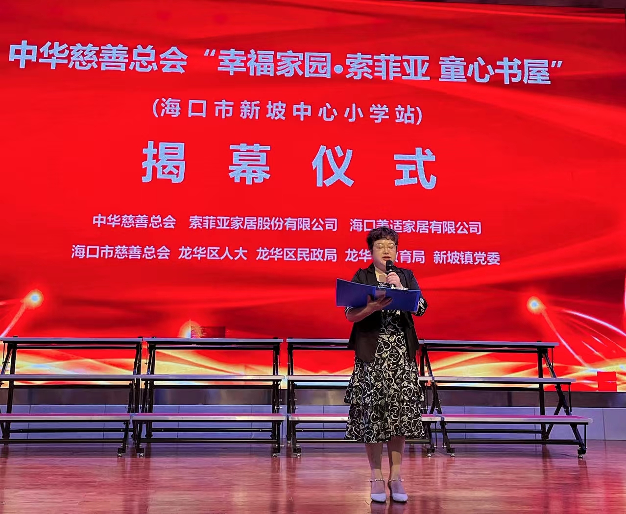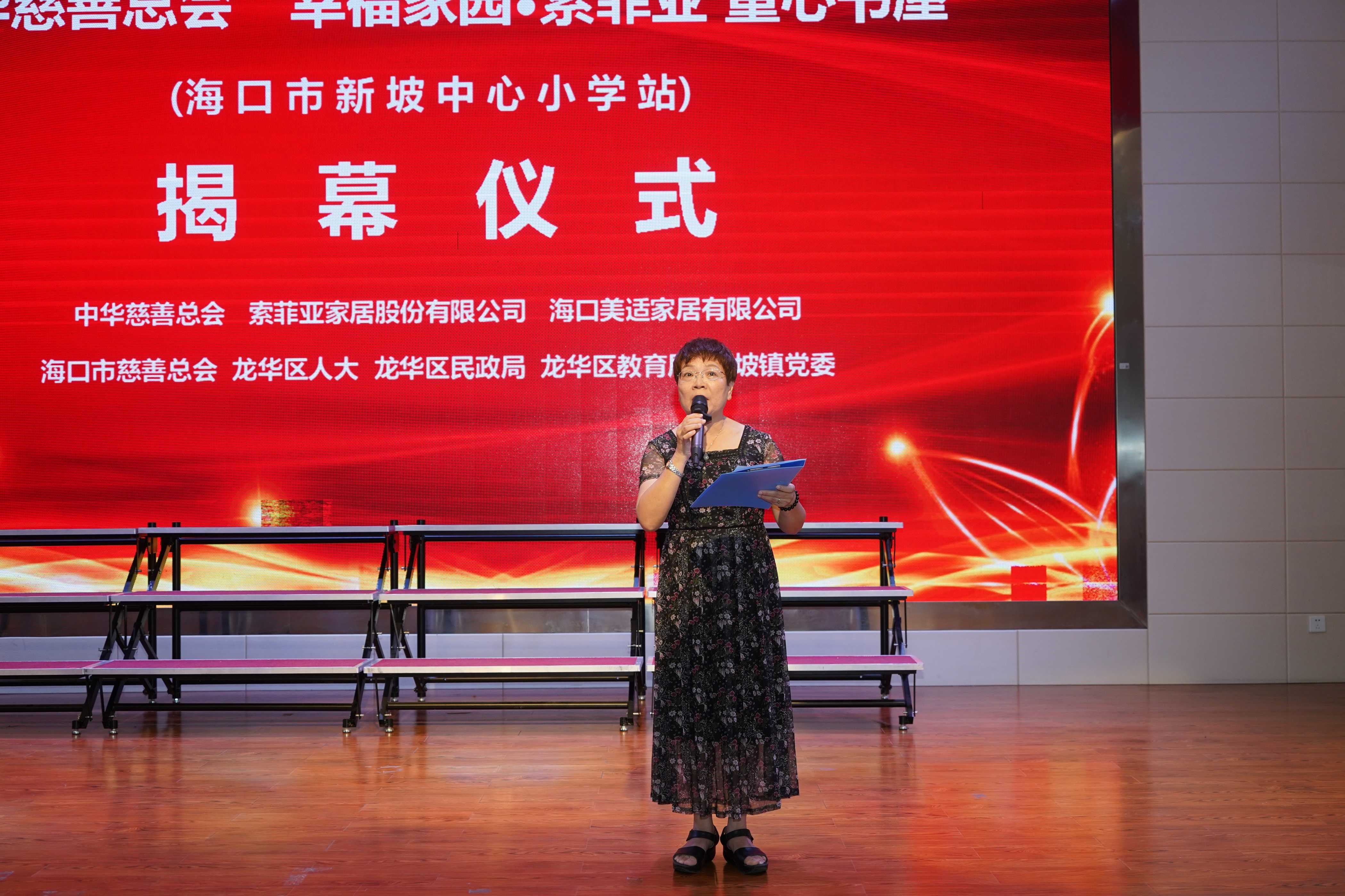 作为总结发言,海口市慈善总会副会长王丽霞表达了对爱心企业索菲亚家居股份有限公司和海口适美家居有限公司的认可和感谢,并宣布新坡中心小学“童心书屋”正式落成。