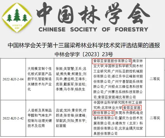2023年4月23日,第十三届梁希林业科学技术奖评选结果公布了自然科学奖、技术发明奖和科学进步奖的获奖名单,索菲亚主导项目“大规模定制个性化板式家居产品数字化智能制造关键技术与产业化”,荣获科技进步奖二等奖,是梁希奖历史上唯一由企业牵头完成的木材加工领域的获奖项目。