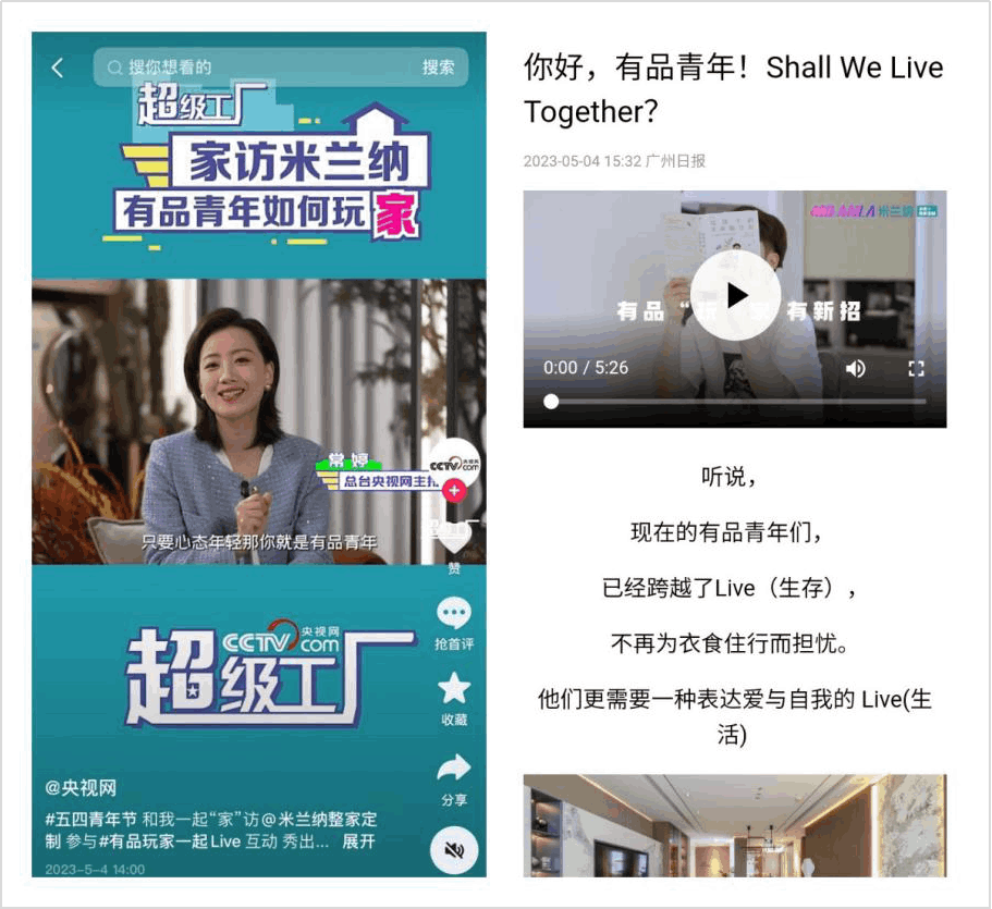 官宣当天,不仅有代言人张常宁吴冠希夫妇在全平台发布态度视频,展现米兰纳为代言人打造的心动之家。还有千万级主流媒体央视网和广州日报等联合发声,以真实的客户案例诠释“有品青年如何玩家”,传递米兰纳“敢想、敢玩、敢爱、一起Live”的品牌态度,为米兰纳有品助阵。