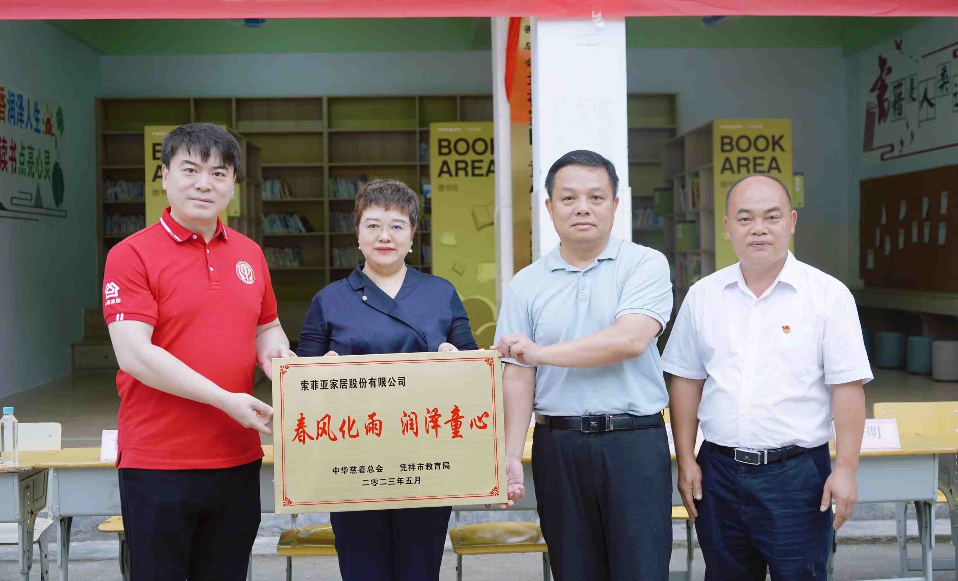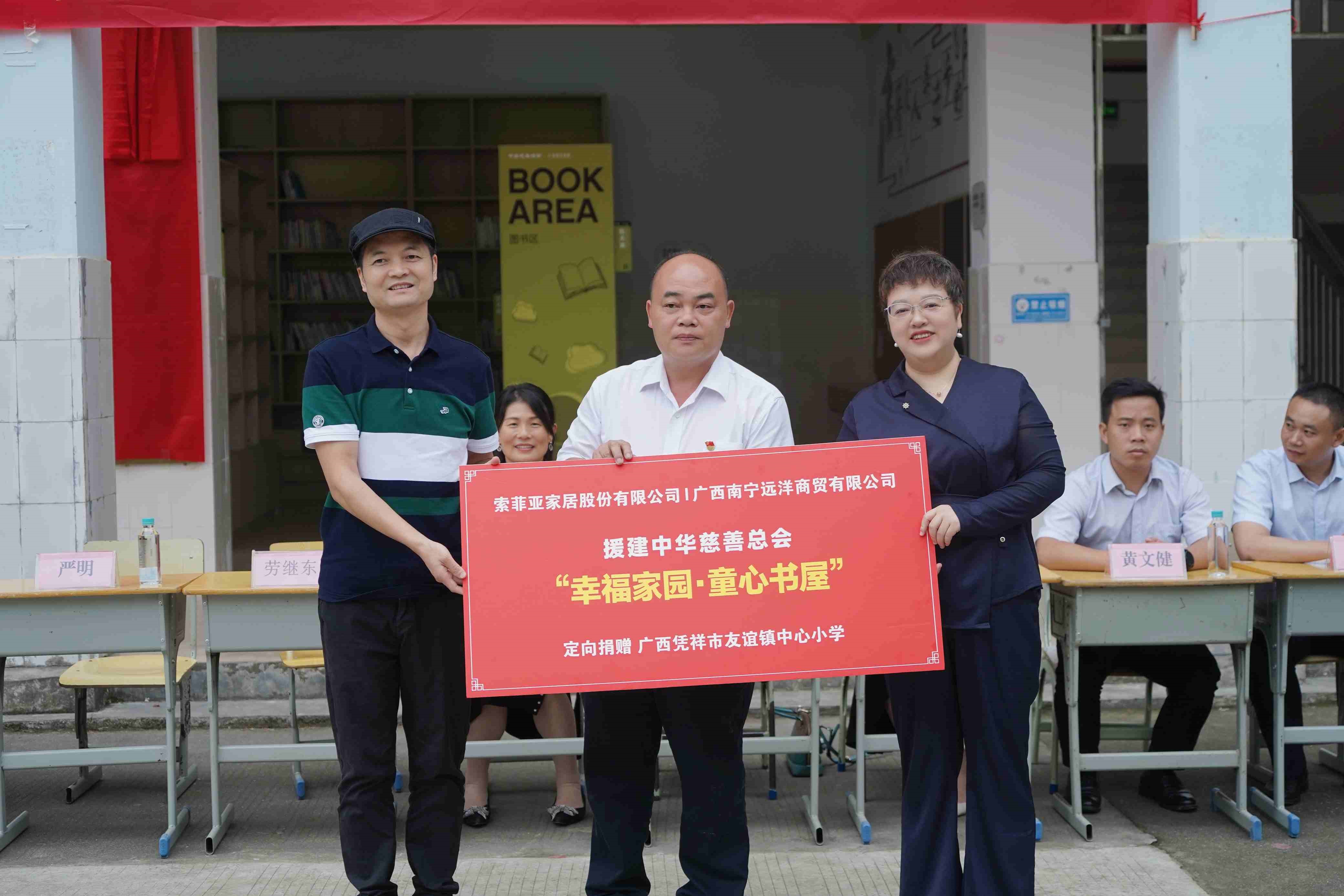 启动仪式上,凭祥市教育局向索菲亚家居股份有限公司和广西南宁远洋商贸有限公司2家捐赠企业赠送爱心牌匾,中华慈善总会新闻界志愿者慈善促进工作委员会副总干事翟红磊宣布友谊镇中心小学“童心书屋”正式落成启用。随后,在师生代表的见证下,友谊镇中心小学“童心书屋”圆满揭幕。