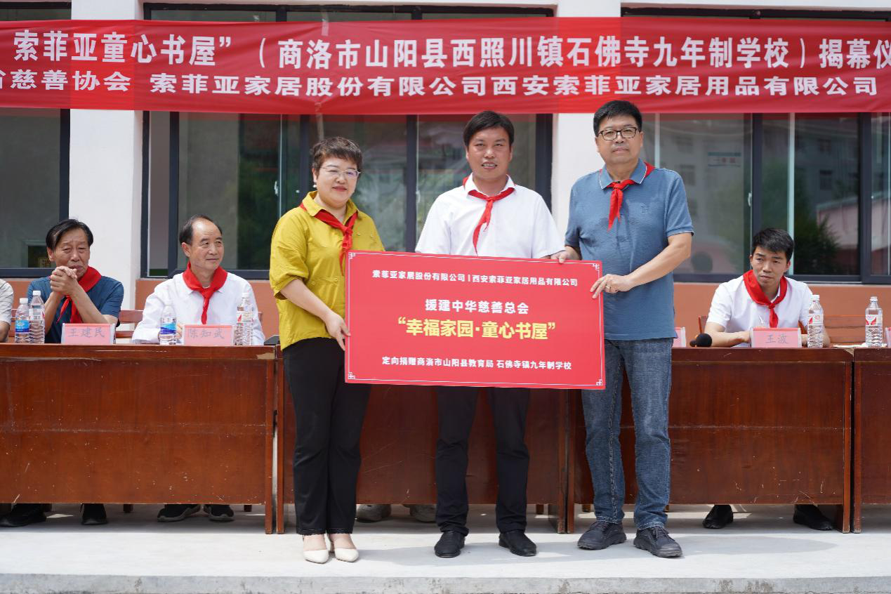 启动仪式上,商洛市慈善协会、山阳县慈善协会,以及石佛寺九年制学校向索菲亚家居股份有限公司和西安索菲亚家居用品有限公司2家捐赠企业颁发爱心牌匾,商洛市慈善协会常务副会长陈知武宣布石佛寺九年制学校“童心书屋”正式落成启用,各方领导代表一同为“童心书屋”揭幕挂牌。
