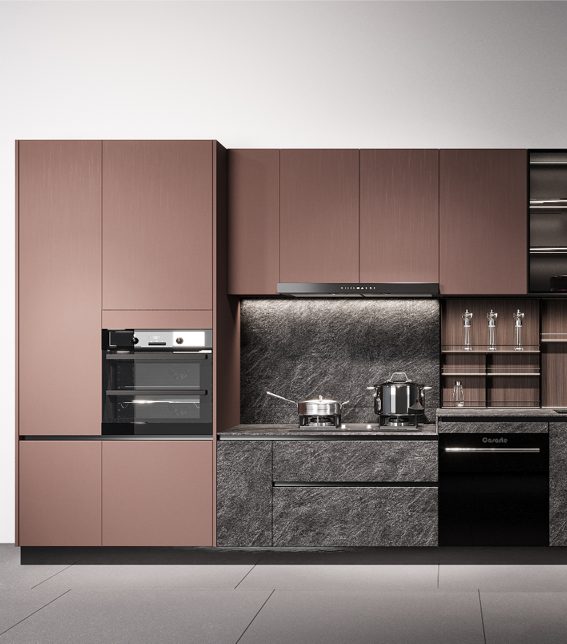 赫岩橱柜的灵感源于燃烧的岩石,赫-表示燃烧的火焰,有希望与光明之意。产品以丝质饰面与岩板的绝妙组合。