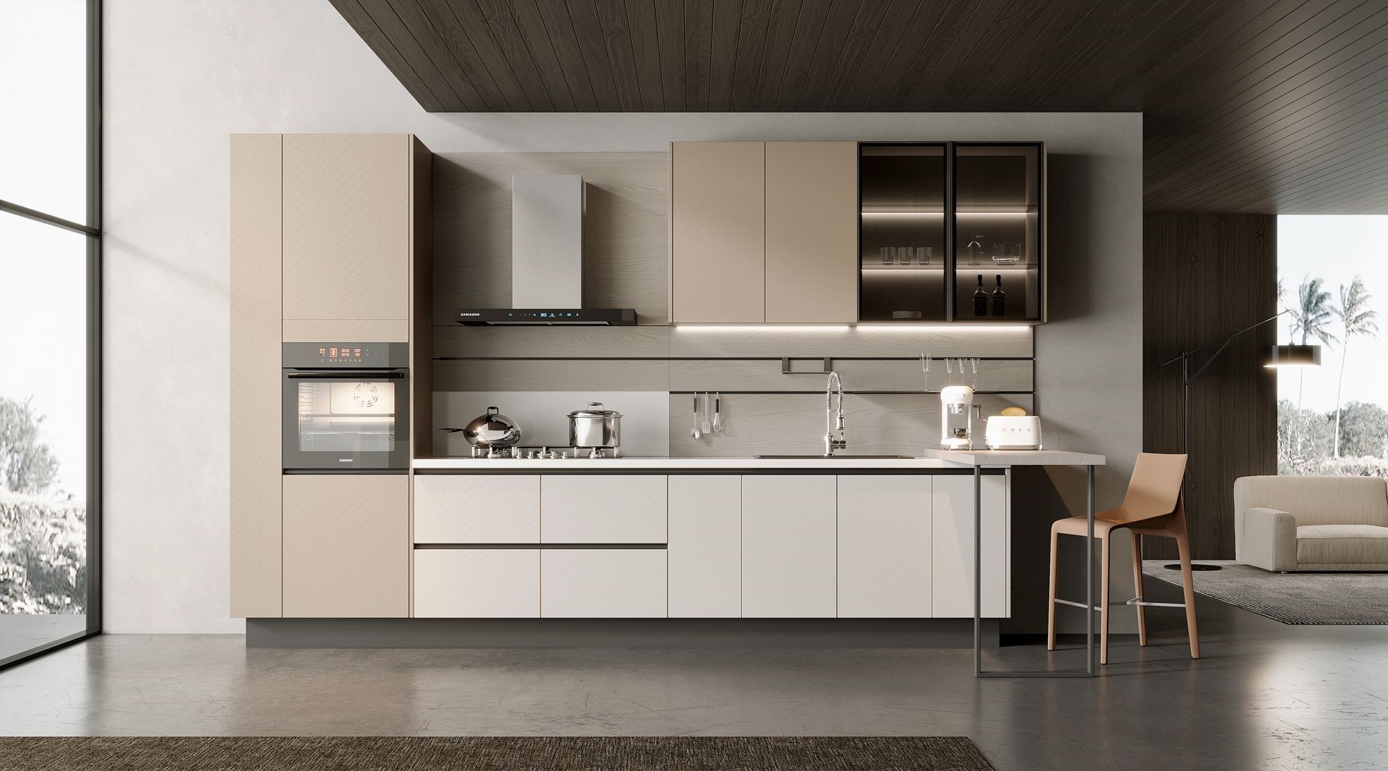 奶油色,“cream-coloured”,介于白色和奶咖色之间的一种饱和度低的驼色系。相比于纯白,多了一分醇厚,比起奶咖色,则又少了一分浓烈。清清淡淡之间呈现出软糯的温柔质感,温暖又百搭。奶油系厨房,细腻自然表面触感,结合特色几何LOGO纹理钢板,在光影下若隐若现。