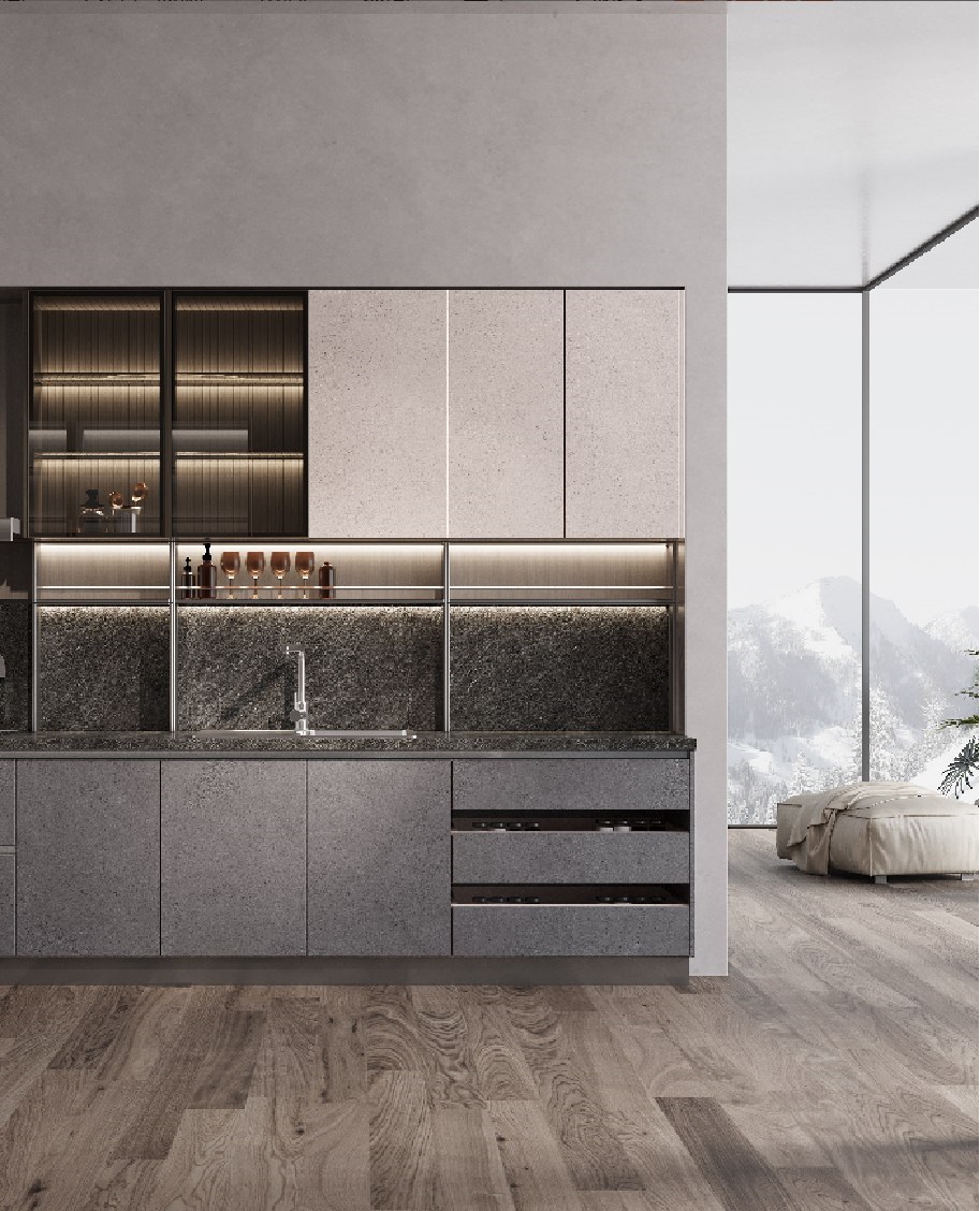 乌鲁克系列巧妙的运用不同色调的岩石表面机理和粗狂而真实的岩石机理配搭,结合现有中国小户型厨房的需求,打造出中国年轻人对厨房的向往和期望。
