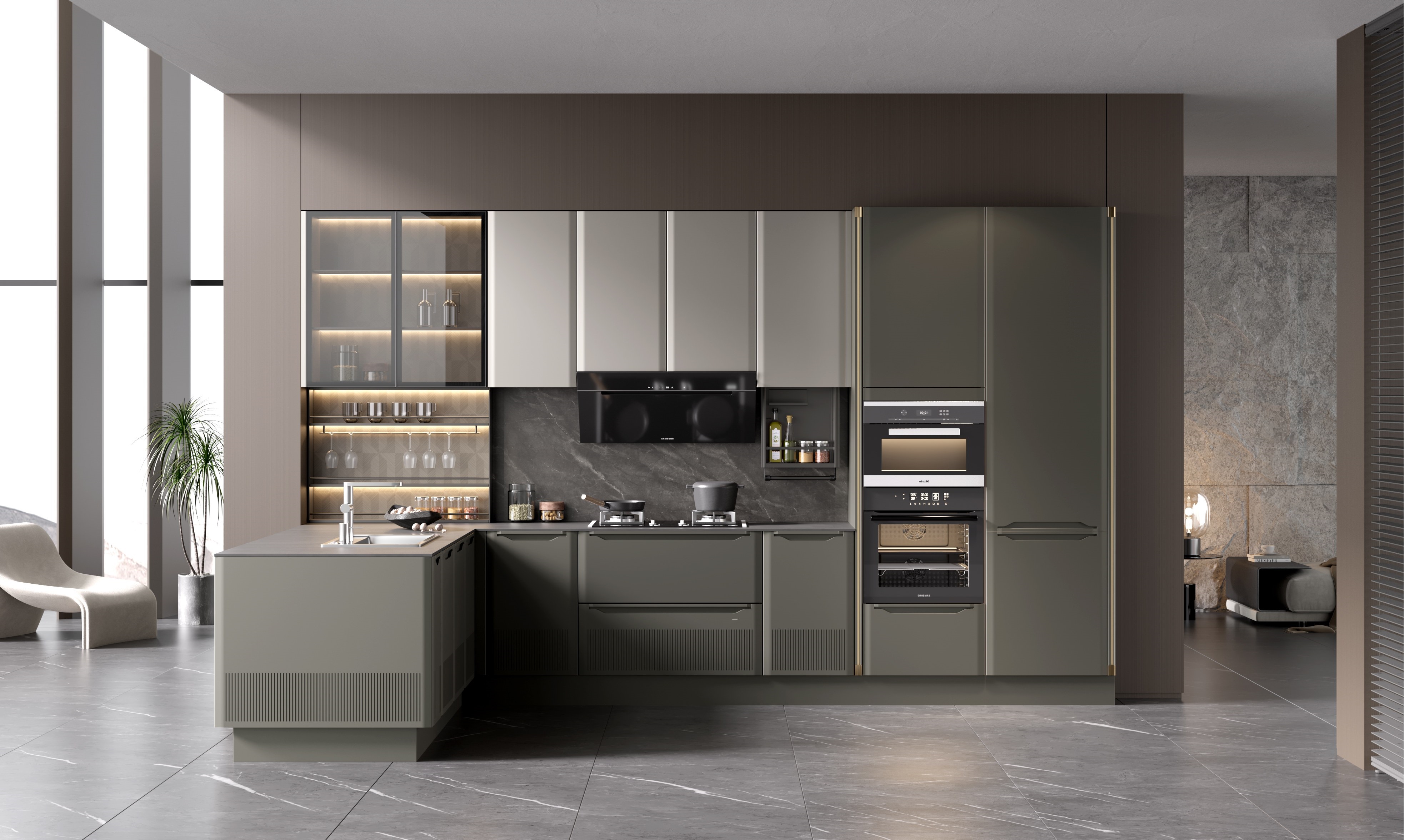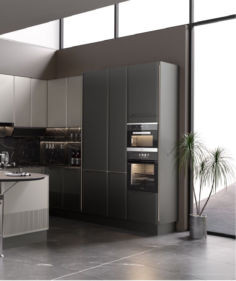 莱萨橱柜的门型设计主要是喷粉可在金属和板材上喷涂,使门板和拉手同色,拉手槽造型复刻法国琴弓弓头造型,镌温柔直立的曲线,赋予产品浪漫气息,造型极具艺术感。莱萨橱柜的整体配色源于莫兰迪的高级色调,低饱和度。 采用索菲亚明星板材,珠光喷粉板,6面一体喷涂,环保且经久耐用。