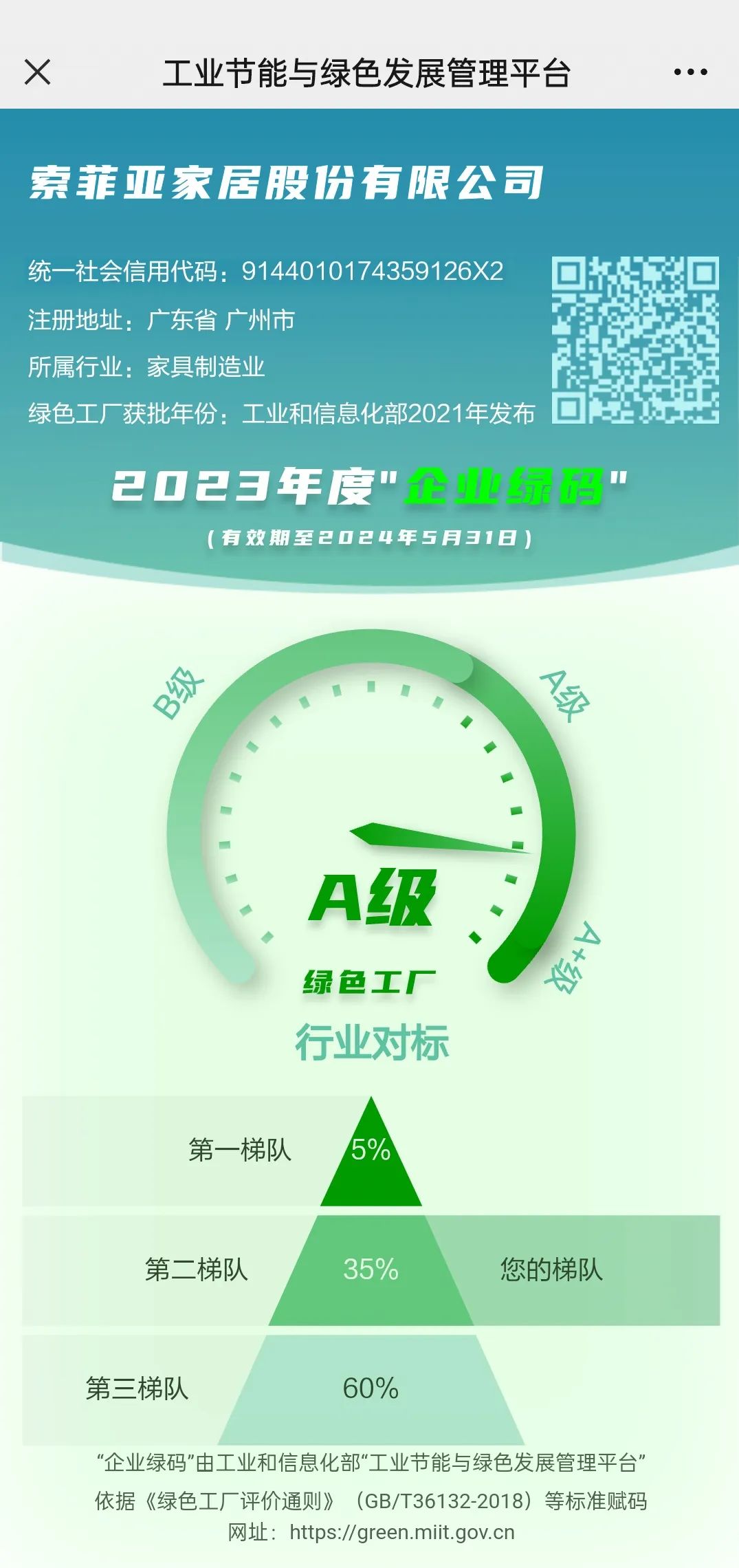 工业和信息化部办公厅依据《绿色工厂评价通则》(GB/T 36132)等相关标准,以及2023年度绿色工厂动态管理报送的绿色绩效数据开发了“企业绿码”,对绿色工厂绿色化水平进行量化分级评价和赋码,直观反映企业在所有绿色工厂中的位置以及所属行业中的位置。国家层面绿色工厂分为A+、A、B三级,比例分别为5%、35%、60%,多年来索菲亚在环保领域的持续深耕,其绿色工厂被评为A级可谓实至名归。秉承“使用绿色环保的生产方式制造绿色环保的家居产品”的生产理念,索菲亚致力于解决社会普遍关心的绿色环保问题,积极开展清洁生产、节能环保工作,生产绿色生态产品,创建绿色工厂,打造行业绿色产业链的战略目标。现如今索菲亚工业4.0生产车间已实现高度信息化与数据化生产,板材贴面、开料、封边、打孔,各流程实现智能协作。整个过程,板件全程不落地、不经人手。同时工厂采用精密生产设备、中央集成自动除尘系统和5S标准化管理,全程绿色制造,减少板材二次污染。作为定制家居行业龙头企业,索菲亚拥有行业最完善的生产力布局,八大生产基地遍布全国东南西北中。索菲亚华东生产基地、华南生产基地和华西生产基地先后获评国家级“绿色工厂”,实现了用地集约化、原料无害化、生产洁净化、废物资源化及能源低碳化,索菲亚绿色制造水平和可持续发展理念也获得国家权威认可。除此之外,索菲亚在信息化、数字化、智能化领域和服务制造领域也曾多次获得国家工信部认可,先后获得“服务型制造示范企业”、“新型信息消费示范单位”、“大数据产业发展试点示范单位”和“国家级工业设计中心”称号。截至目前,索菲亚家居共8次获得工信部权威认可。