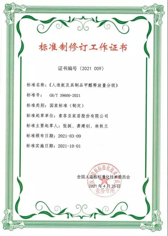 正如本次大奖主办方的解读:质量检验作为确保产品质量的基础,贯穿于研发、生产、消费的全过程,检测报告是质量管理的“体检证”、市场经济的“信用证”、国际贸易的“通行证”。再看2021年发布的两项人造板新国标——GB/T 39600-2021 《人造板及其制品甲醛释放量分级》、GB/T 39598-2021 《基于极限甲醛释放量的人造板室内承载限量指南》,索菲亚家居赫然位列主要起草单位名单中,也是由于索菲亚多年来检测数据的积淀,为国标的诞生提供了大量的科学依据,让行业规范往前走了一大步。