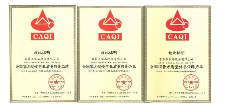 今年3月,中国质量检测协会发布表彰名单,定制家居行业龙头企业索菲亚家居获得“全国家具制造行业质量领先企业”、“全国家具制造行业质量领先品牌”、“全国消费者质量信誉保障产品”三大奖项。索菲亚已连续2年在该表彰中包揽多个大奖,目前已经获得6项由中国质量检测协会颁发的荣誉。
