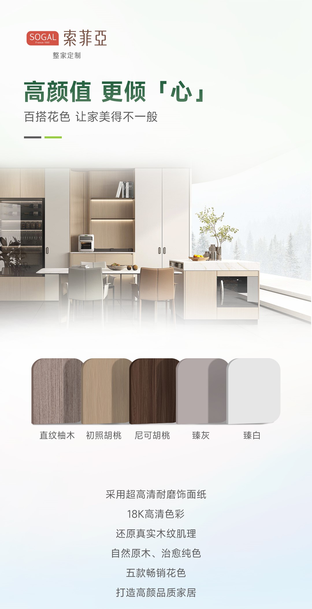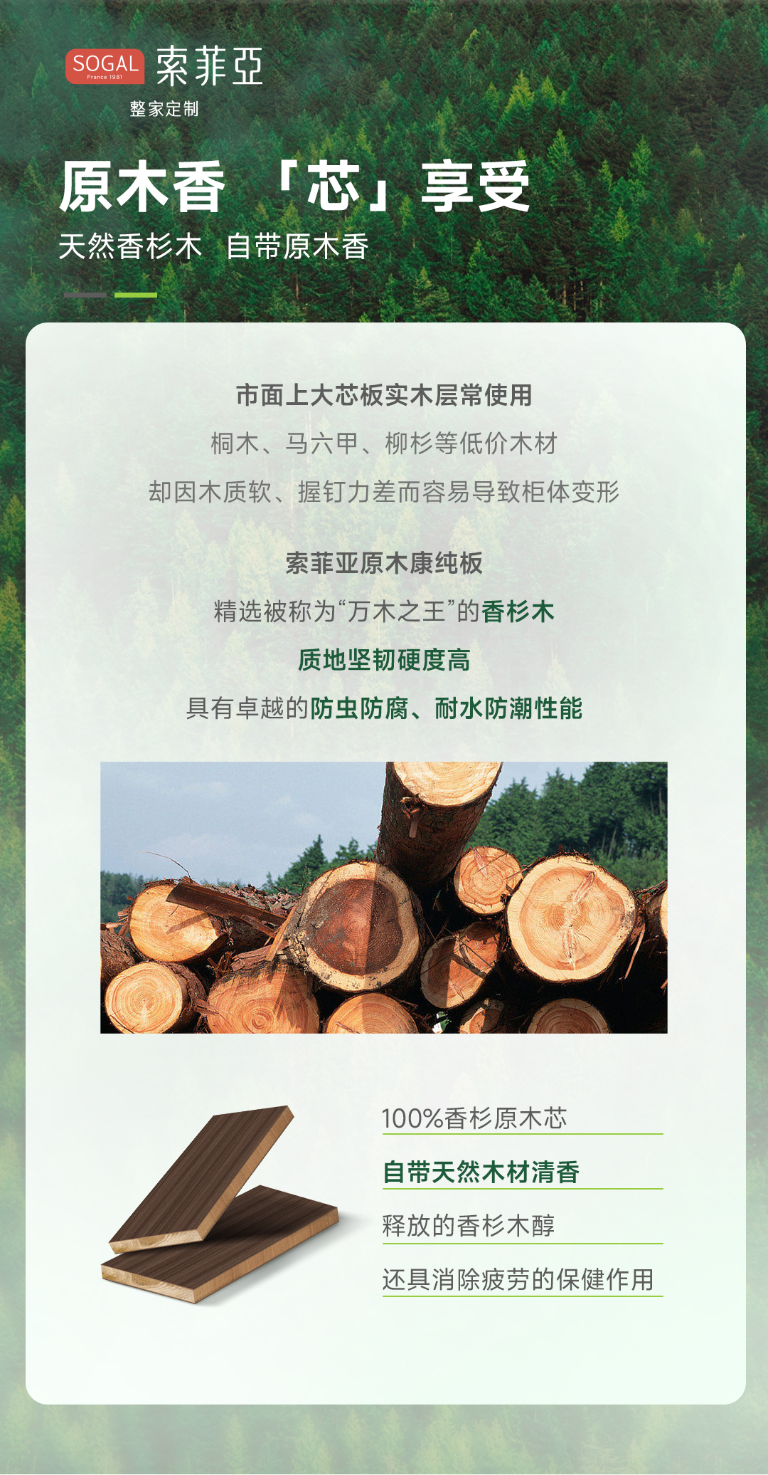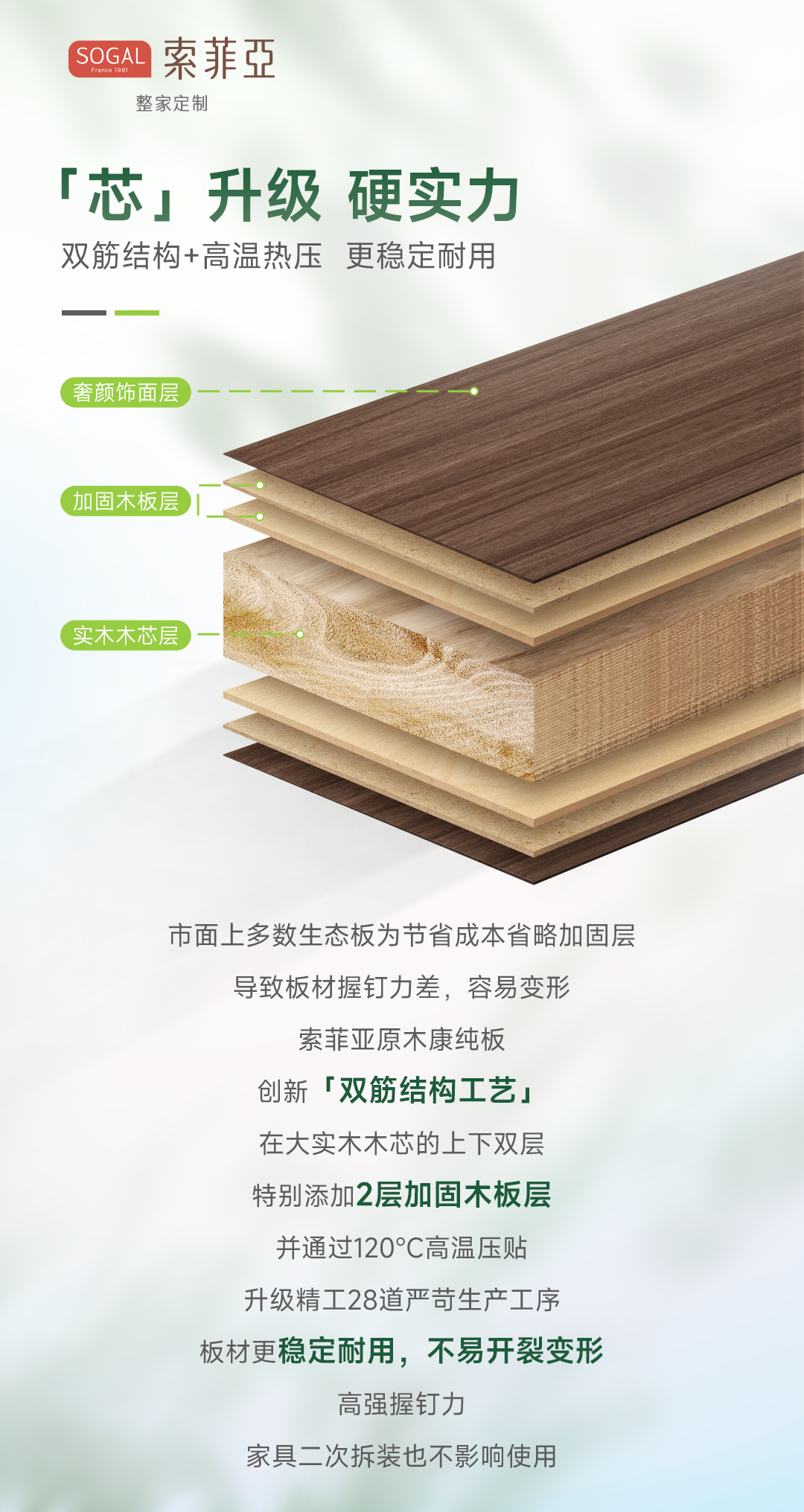 索菲亚原木康纯板,精选生态原木基材,环保性能远优于国标ENF级*。天然香杉原木芯,防虫防腐、耐水防潮性能更强,自带原木香,焕新家居舒适体验。创新「双筋结构工艺」,板材不易开裂变形,让家长久耐用。五款畅销花色打造高颜品质家居。
