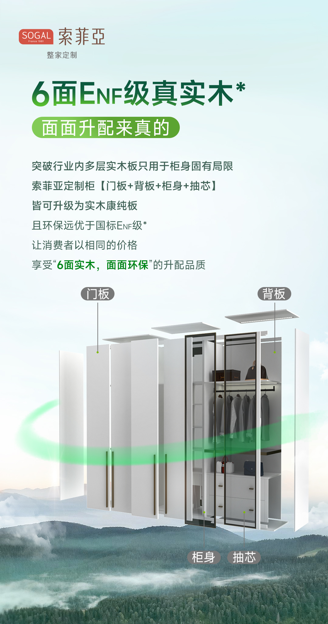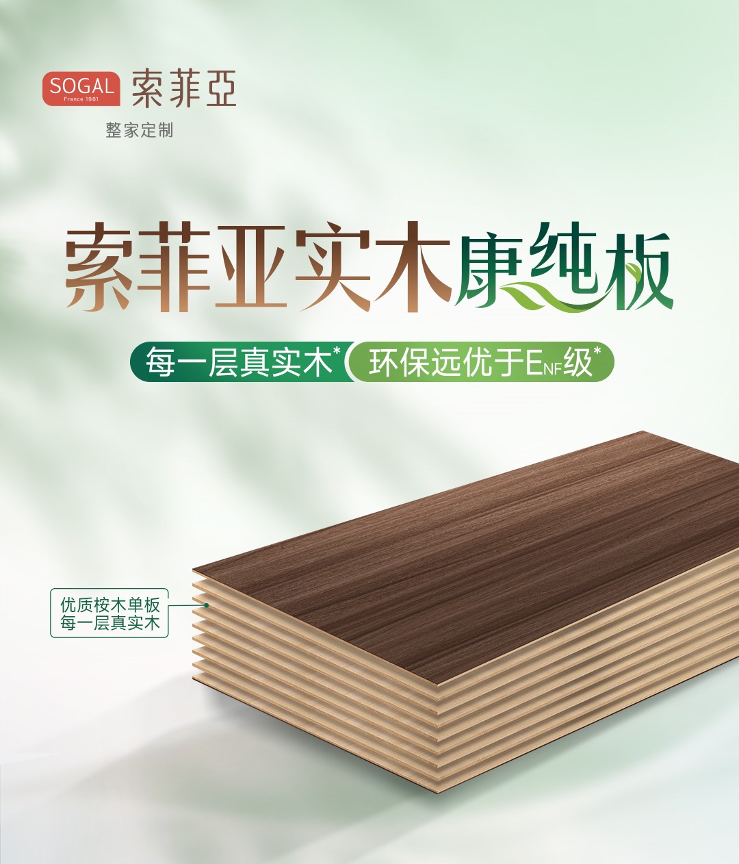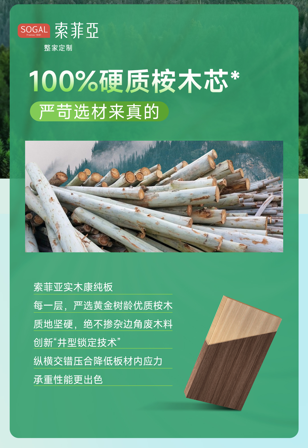 索菲亚实木康纯板,严选黄金树龄硬质桉木,100%实木芯*,环保性能远优于国标ENF级*。突破行业内多层实木板只用于柜身固有局限,索菲亚定制柜【门板+背板+柜身+抽芯】皆可升级为实木康纯板,让消费者以相同的价格,享受“6面实木,面面环保”的升配品质。