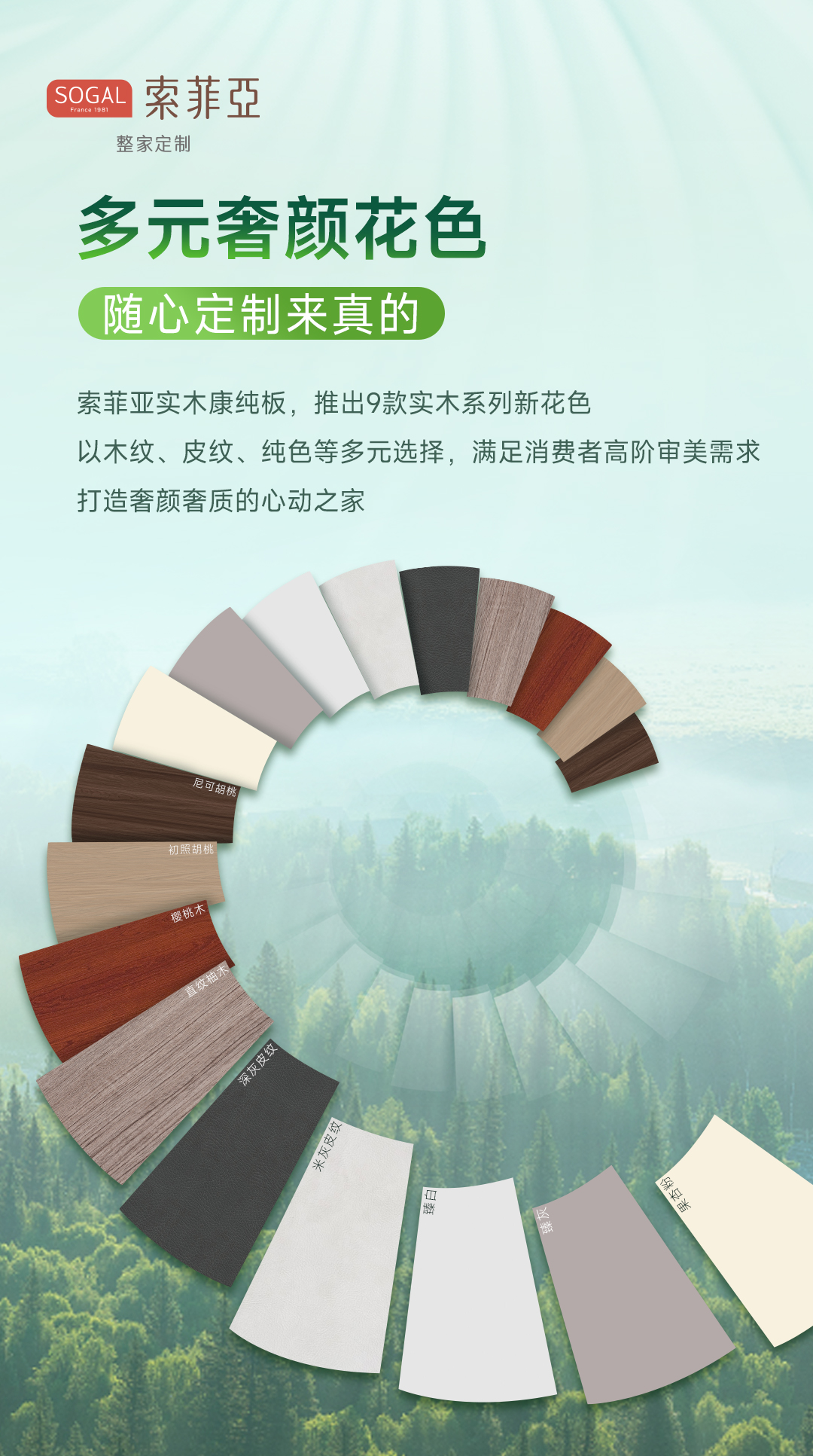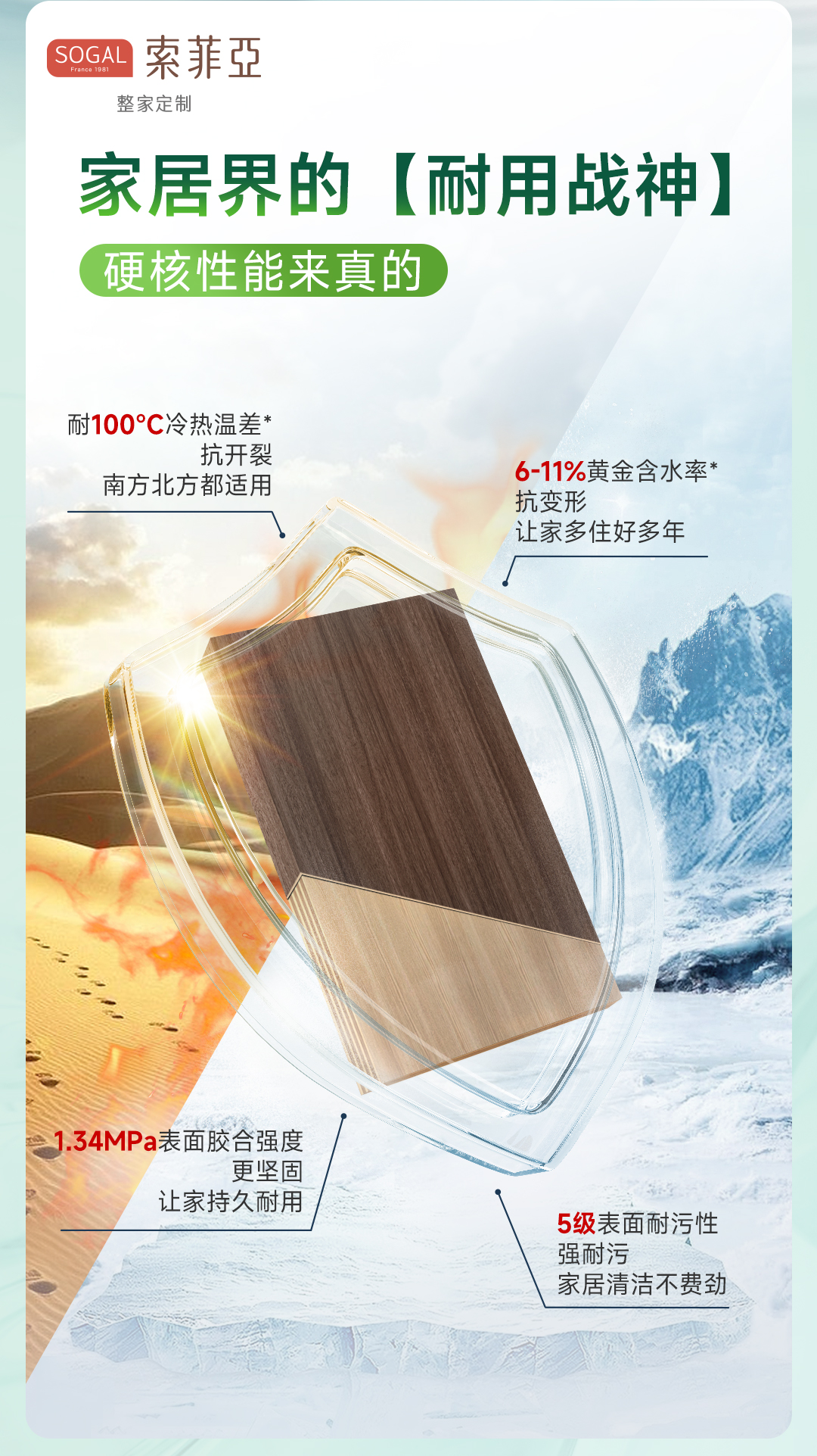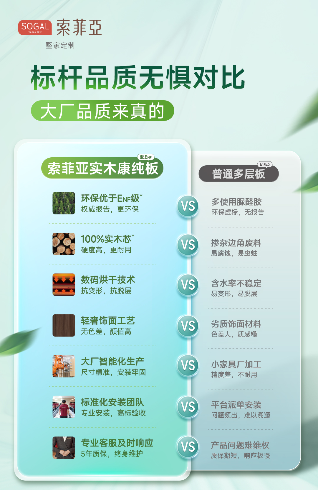 索菲亚实木康纯板,严选黄金树龄硬质桉木,100%实木芯*,环保性能远优于国标ENF级*。突破行业内多层实木板只用于柜身固有局限,索菲亚定制柜【门板+背板+柜身+抽芯】皆可升级为实木康纯板,让消费者以相同的价格,享受“6面实木,面面环保”的升配品质。